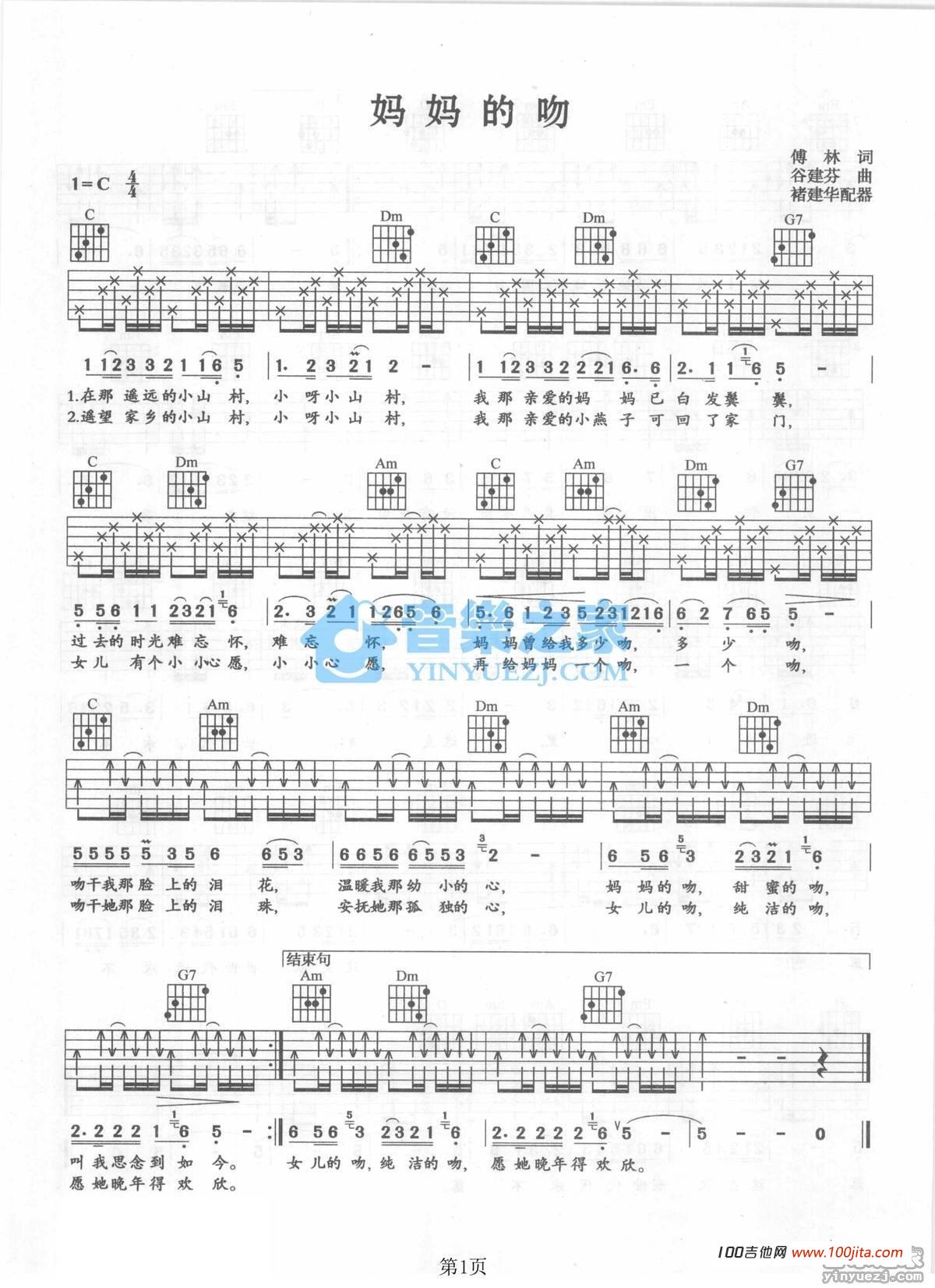 曲谱介绍: 《妈妈的吻》吉他弹唱谱,采用C调指法编配,共有1张高清图谱,免翻页排版设计。