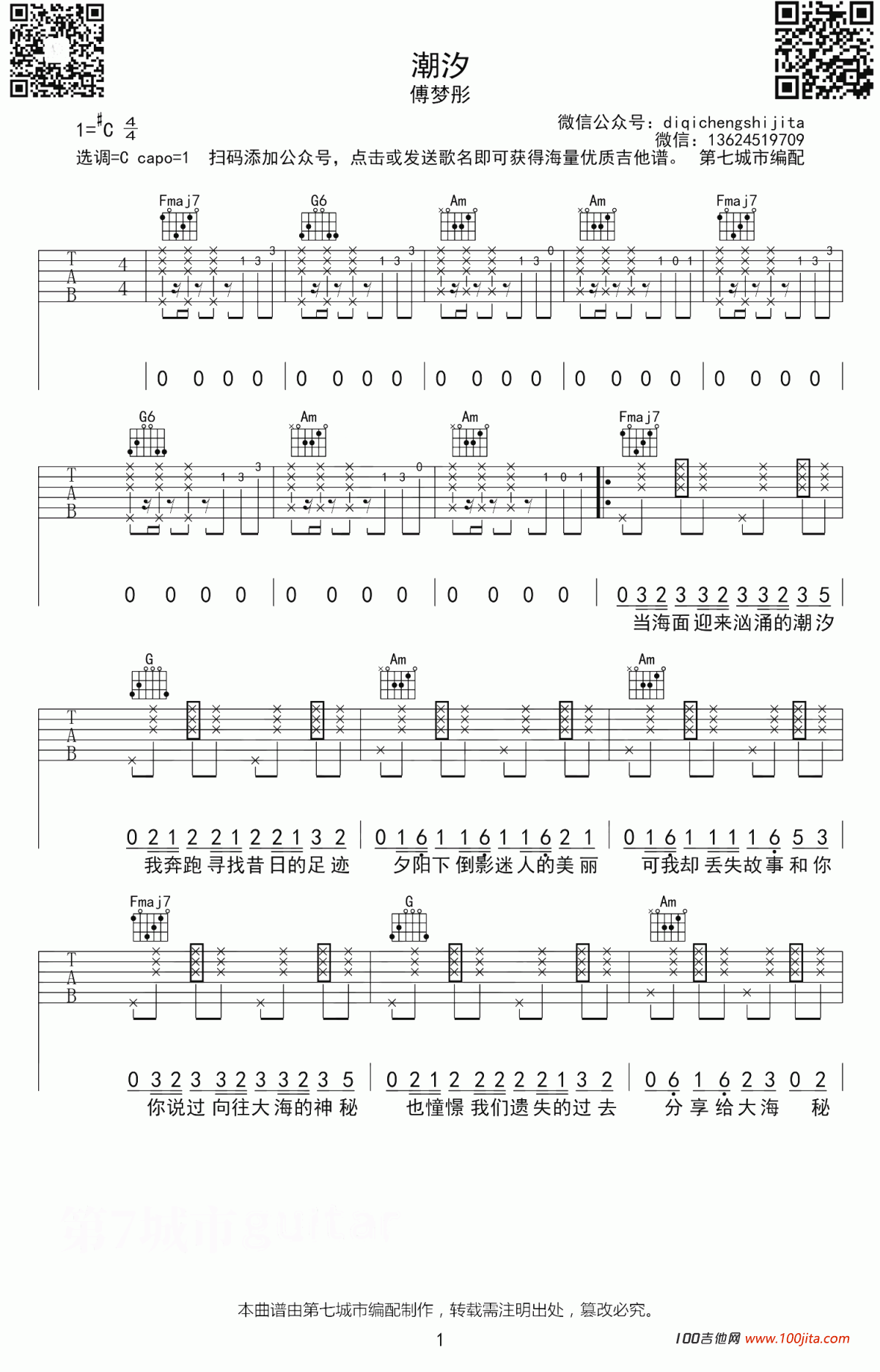 曲谱介绍: 《潮汐》吉他谱是根据歌手付梦彤唱的一首歌编写的六线谱。吉他谱采用C调和弦编配,非常好听的一首歌曲。歌曲采用那女声的合唱让歌曲声色不少。1=c4第七城市编配制作,琴谱网编辑整理。
