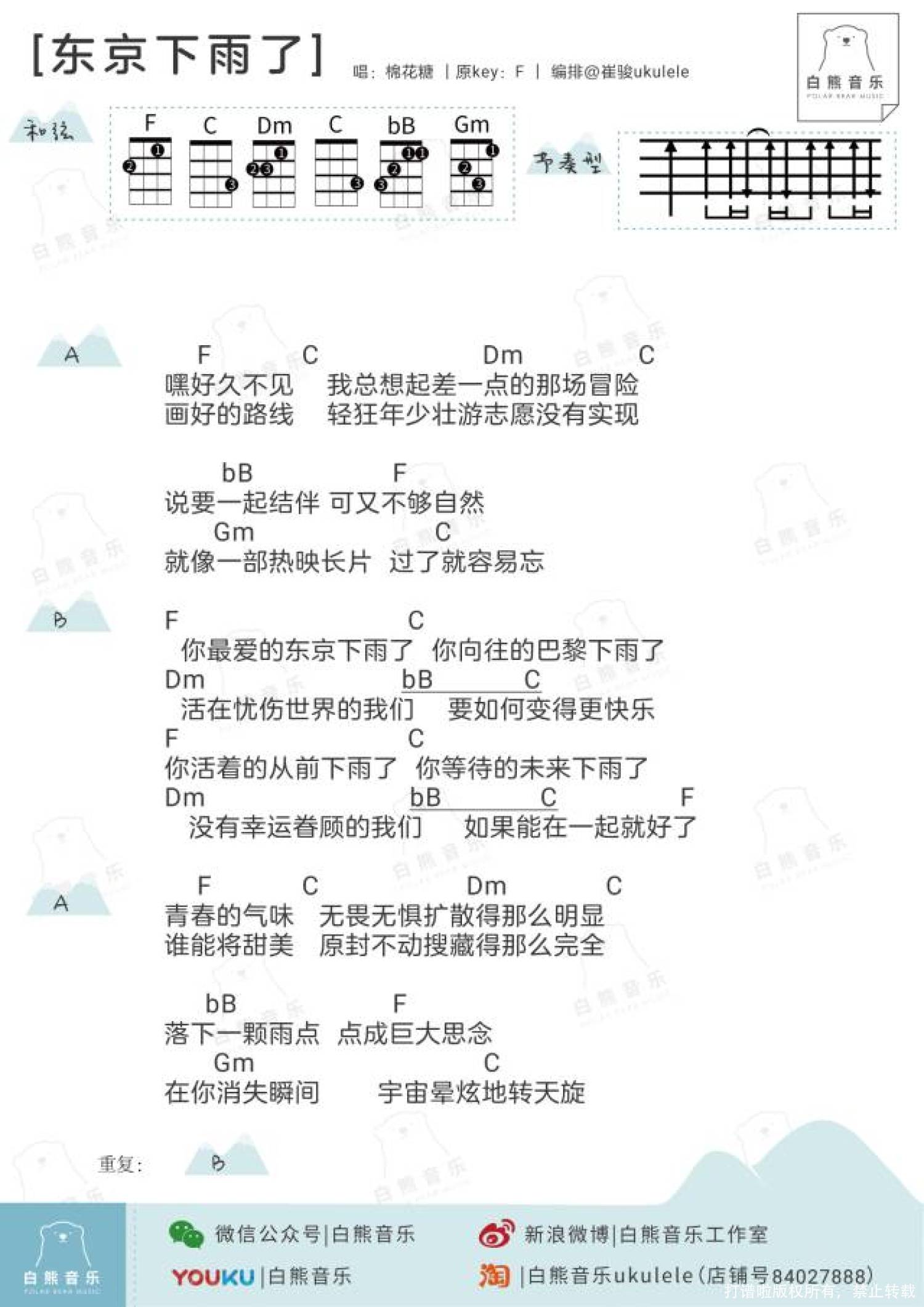 曲谱介绍: 棉花糖组合《東京下雨了》_F调尤克里里谱