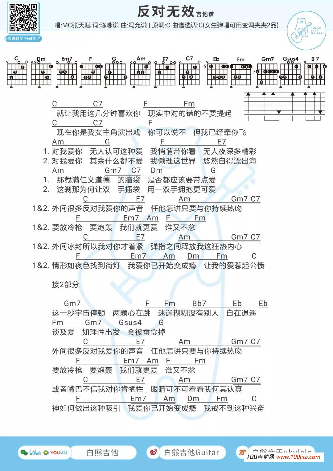 反对无效吉他谱 - 张天赋 - C调吉他弹唱谱