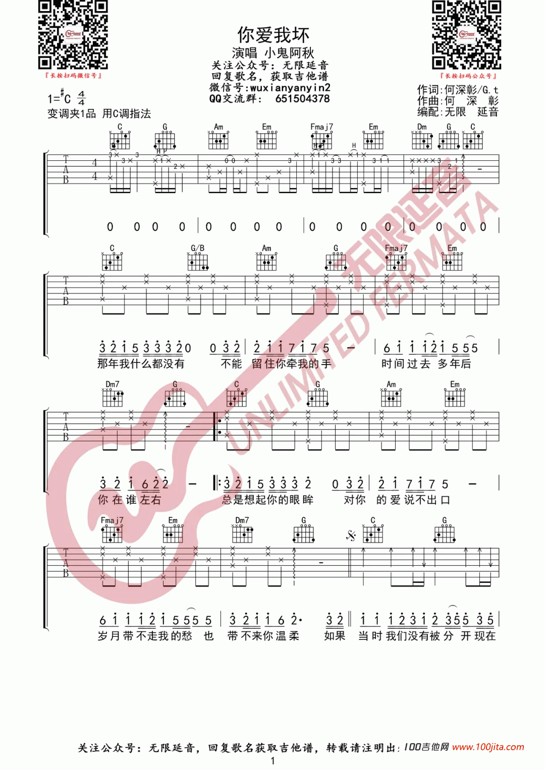 曲谱介绍: 《你爱我坏》吉他谱是根据小鬼阿秋的一首歌编配的六线谱。吉他谱采用C调和弦编配,非常好听的一首歌曲。演唱:小鬼阿秋 作词:何深彰/G.t1=C4 作曲:何深彰 变调夹1品用C调指法。