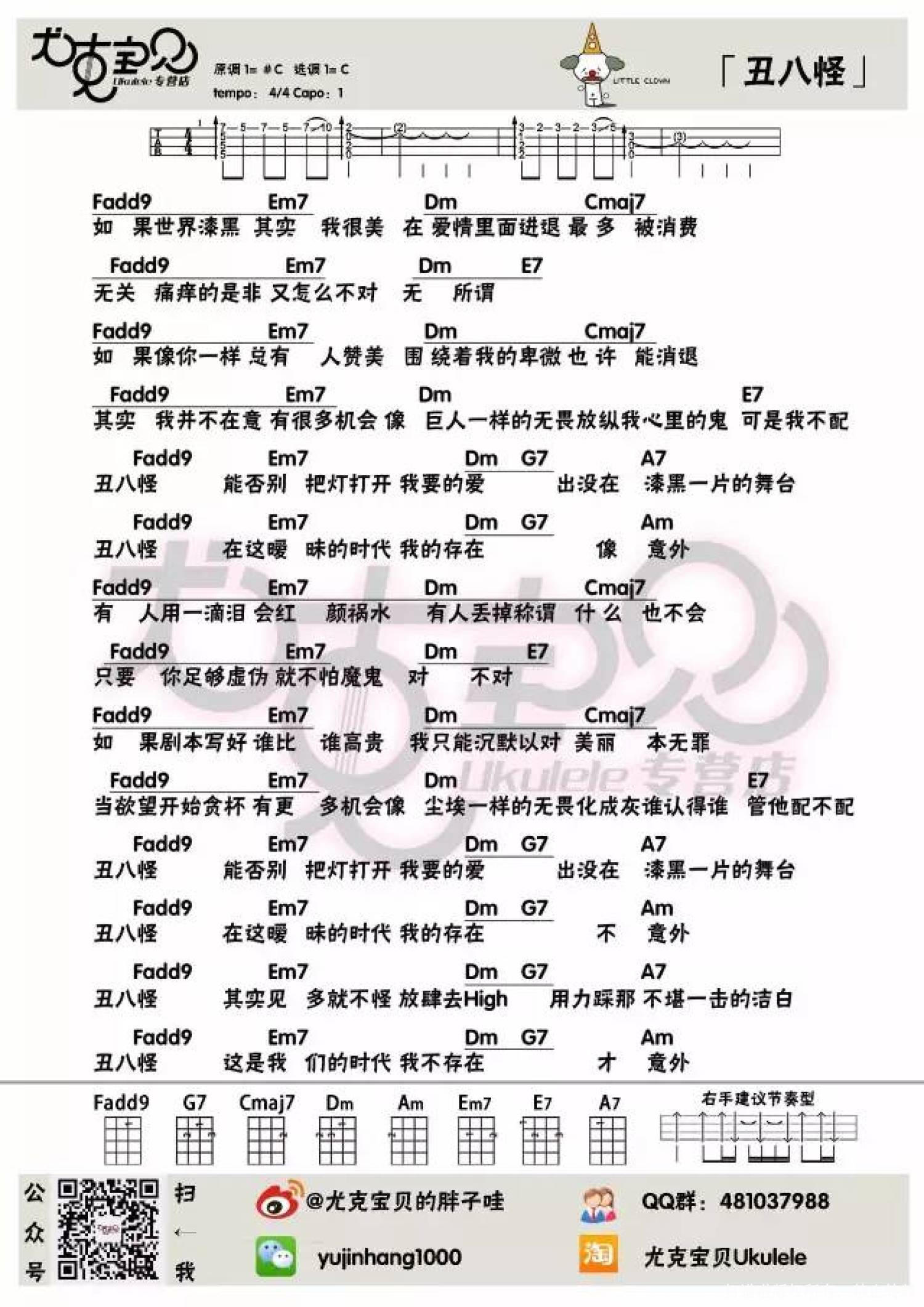 曲谱介绍: 李荣浩《丑八怪》_C调尤克里里谱