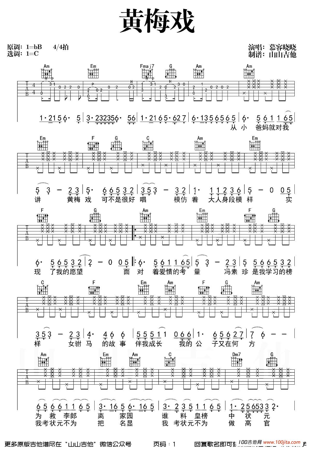 黄梅戏吉他谱 - 慕容晓晓歌曲 - C调吉他弹唱谱