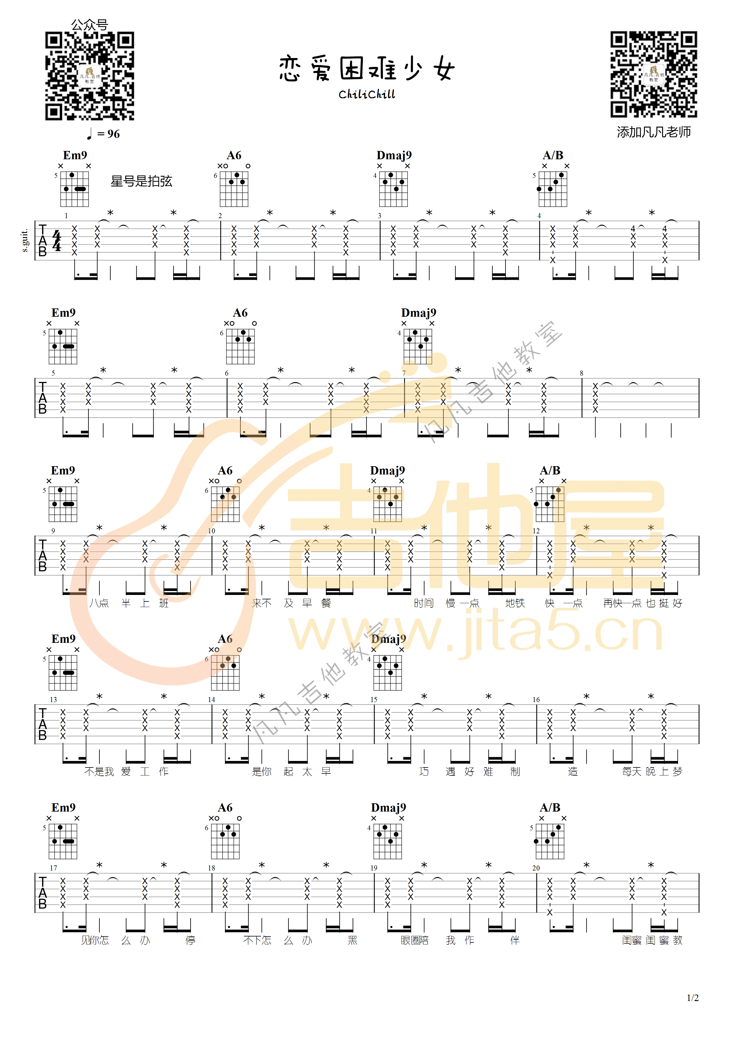 曲谱介绍: 《恋爱困难少女》吉他谱_ChiliChill_D调弹唱六线谱_高清图片谱分享,《恋爱困难少女》是由ChiliChill演唱的一首节奏轻快的歌曲。 吉他弹唱演示及视频教学
