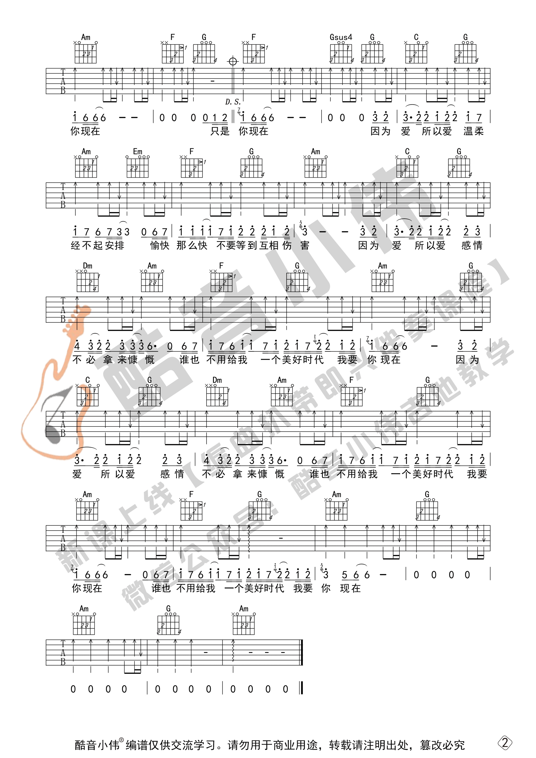 曲谱介绍: 曲谱适合初学者练习,选用C调指法,变调夹的位子可以根据我的推荐来选择。使用分解+扫弦伴奏型,先弹奏会曲谱,再清唱会,然后弹唱结合一起练习。