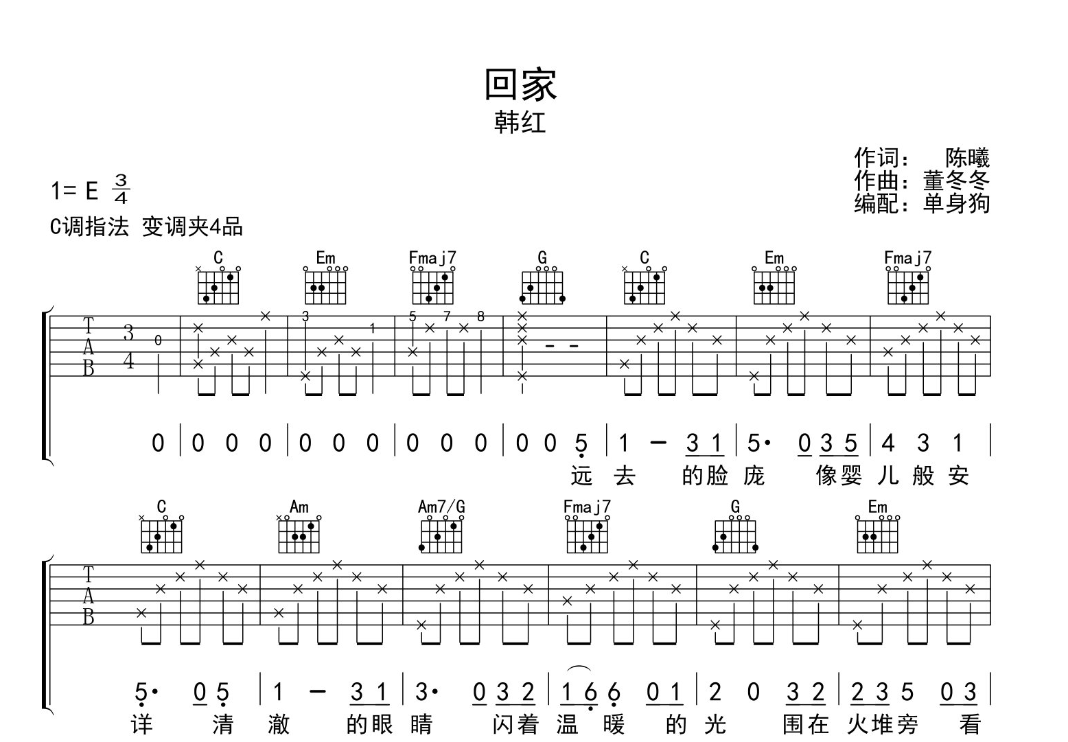 曲谱介绍: 韩红《回家》吉他谱_《回家》C调弹唱六线谱分享,《回家》是电影《狙击手》主题曲,由陈曦作词,董冬冬作曲,韩红演唱,深情而清澈的嗓音,韩红将人世间的离合之情在歌曲中表现了出来,我们虽然很多时候不得已走出家乡,但我们应当要记得回家的安排,以及家乡和亲人的模样,因为有一种归途心绪永不能忘。 韩红《回家》吉他谱,单身狗制谱,选用C调,《回家》弹唱六线谱,共两张高清图片谱,曲谱包含完整前奏,分解和弦弹唱,难度初级。