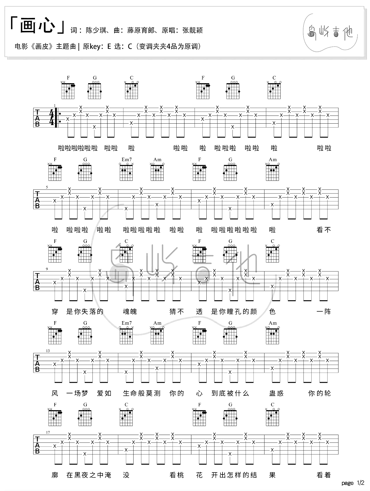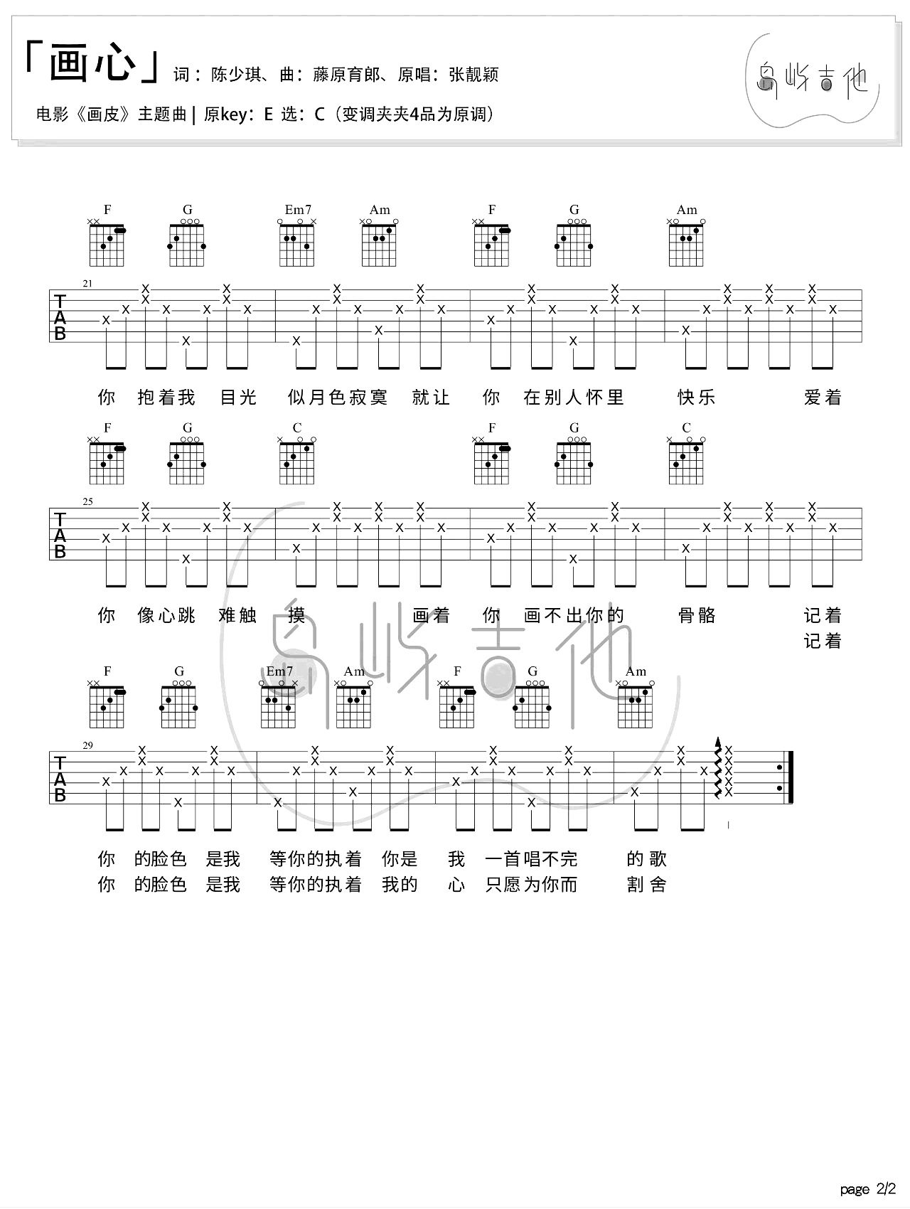 曲谱介绍: 画心吉他谱,张靓颖为电影《画皮》演唱的主题曲,。原调E选调C,变调夹夹四品为原调,《画皮》吉他弹唱谱,两张图片六线谱。 这首歌不但旋律动人,仅歌曲开头的吟唱就足以勾人魂魄。这段吟唱是张靓颖“擅自做主”加入的,目的就是为了迎合剧情,把让人意味深长的情感都表达出来,而这首歌也像电影一样被大家喜欢着。