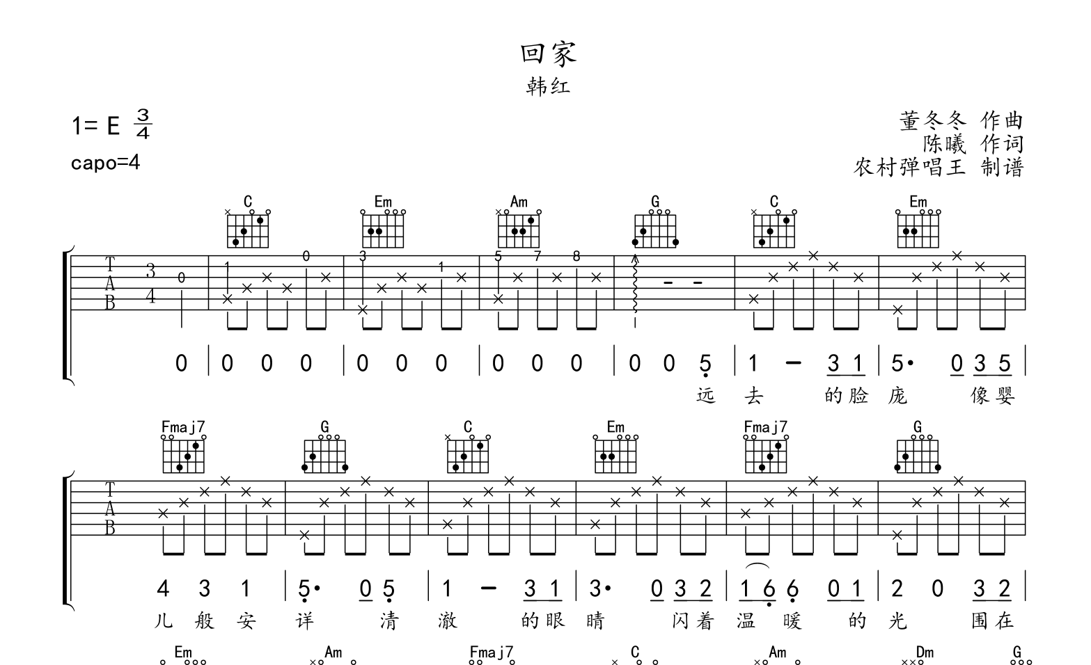 曲谱介绍: 回家吉他谱_韩红_《回家》C调男女通用版六线谱分享,这首《回家》,是由董冬冬、陈曦“冬曦”组合强强联袂创作。旋律较强的亲和感,就像和亲人拉家常一般,歌词十分贴合生活,亲近得可以听到完整的呼吸和心跳声。歌曲非常丰富的表达了对家的思念之情,歌词的调性和旋律的速度,完好相融,显现出创作者的非凡功力。 由创作者@农村弹唱王制谱的《回家》吉他谱,韩红演唱,选用C调,原调E调,《回家》吉他弹唱谱,包含完整前奏,全曲主要以分解和弦弹唱,难度初级简单。