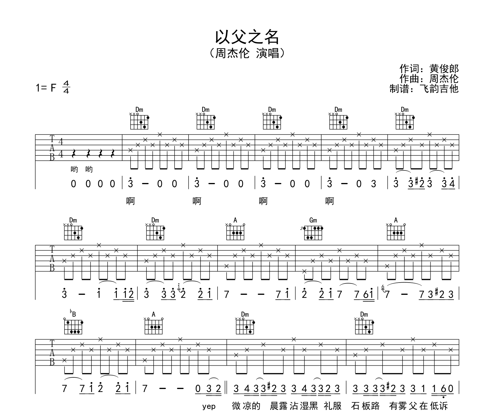 曲谱介绍: 周杰伦《以父之名》,音乐风格的古典RAP,以父亲的名义,意大利歌剧,无法预测的灵感。意大利祈祷独白营造了一种教父的氛围。女高音的歌唱增加了一种神秘感,充满层次感的弦乐和枪声急剧增加了画面感,让每个人都能看到一位纯洁的曾经和残酷而温柔的黑道教父。 由创作者何奔洋制谱的《以父之名》吉他谱,周杰伦演唱,选用F调指法,《以父之名》吉他六线谱,共四张高清图片谱例,本谱以分解和弦+扫弦节奏弹唱全曲,难度初级简单。