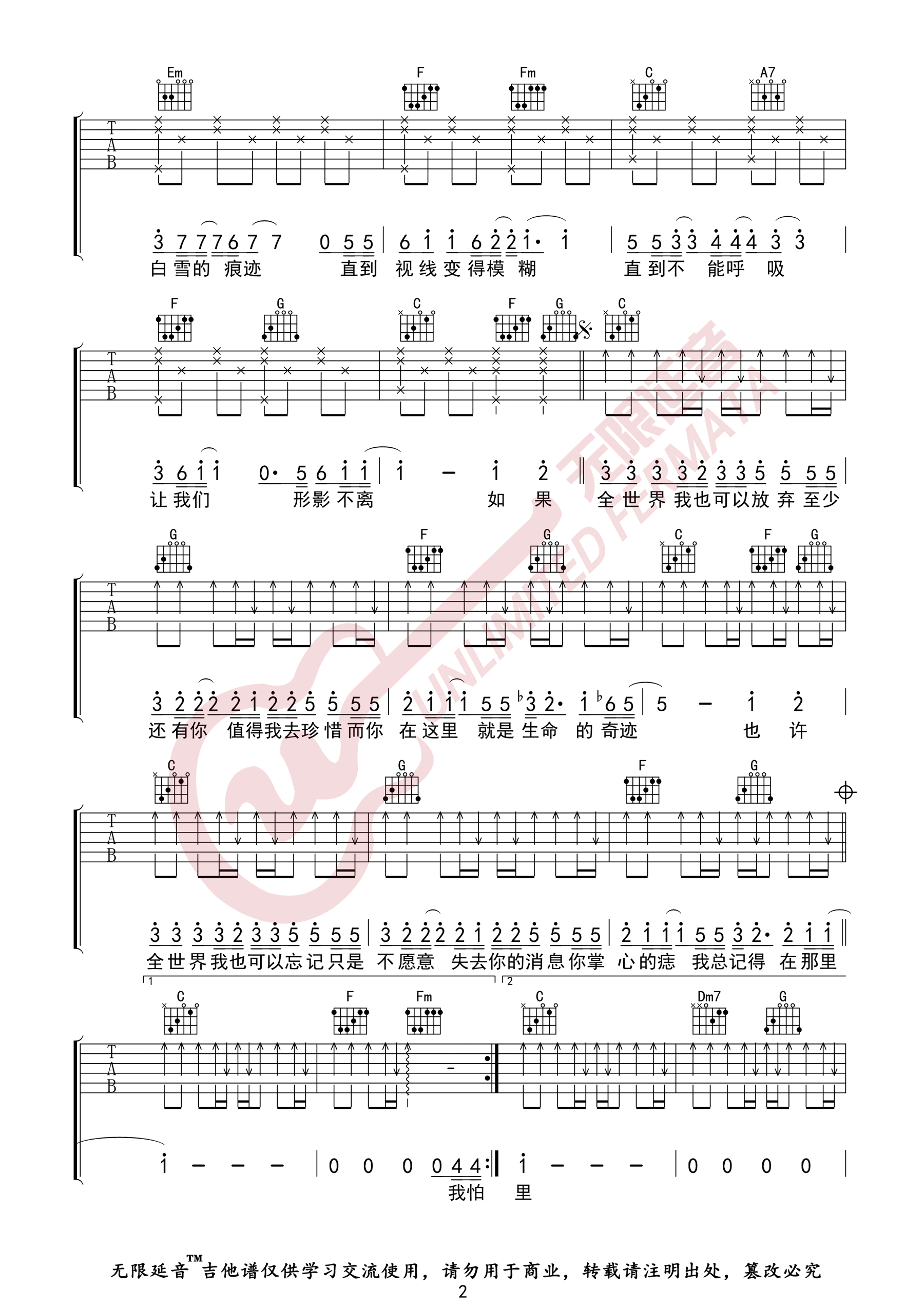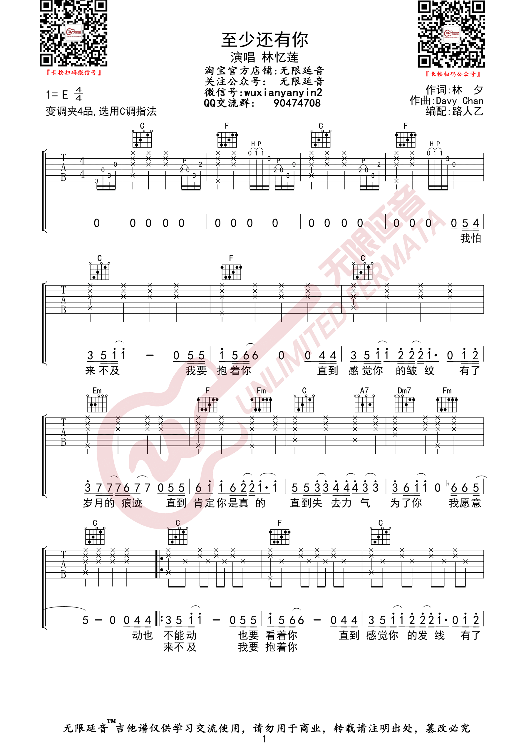 曲谱介绍: 至少还有你吉他谱_林忆莲_《至少还有你》C调弹唱谱_高清六线谱分享,《至少还有你》是由林忆莲演唱的歌曲,由林夕作词,这首歌也是传唱度和翻唱度极高的歌曲。歌曲的感情可以很宏大,大到全世界都可以放弃忘记、大到相爱成为生命的奇迹,也可以很渺小 ,小到只在乎珍惜你、小到只想和你形影不离。歌曲的情感也从大到小再细致入微的温暖听众同时,也让人明白相爱也需互信的道理。