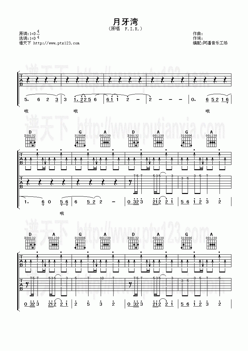 曲谱介绍: 飞儿乐团(F.I.R)《月牙湾》吉他弹唱谱,采用D调指法编配,共有4张高清图谱。