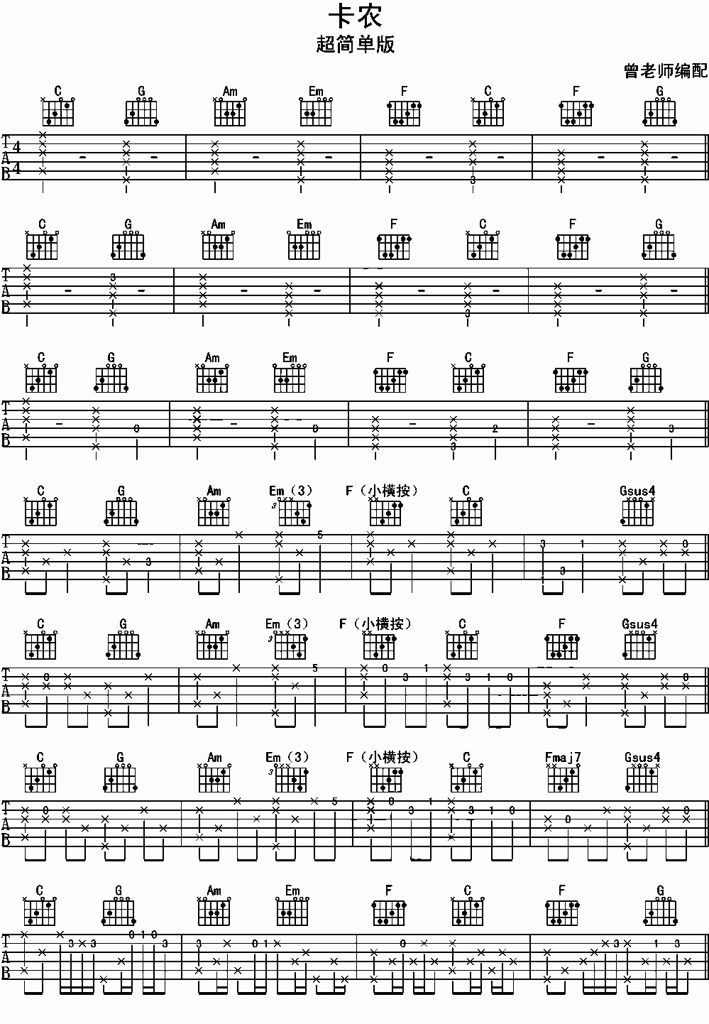 曲谱介绍: 《卡农超简单版》吉他弹唱谱,共有3张高清图谱。
