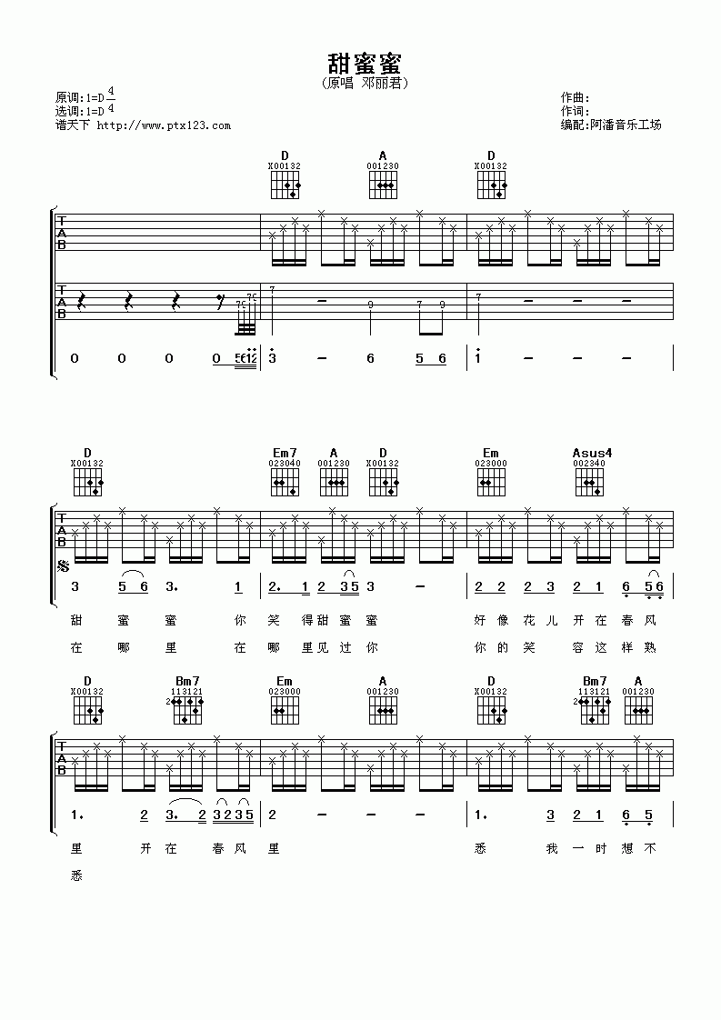 曲谱介绍: 邓丽君《甜蜜蜜》吉他弹唱谱,共有2张高清图谱,免翻页排版设计。
