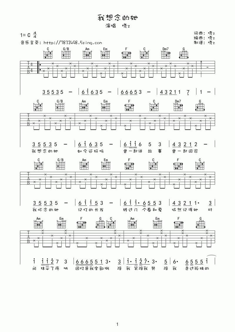 哓Z原创 我想念的她吉他谱 - 哓Z原创 - 吉他弹唱谱