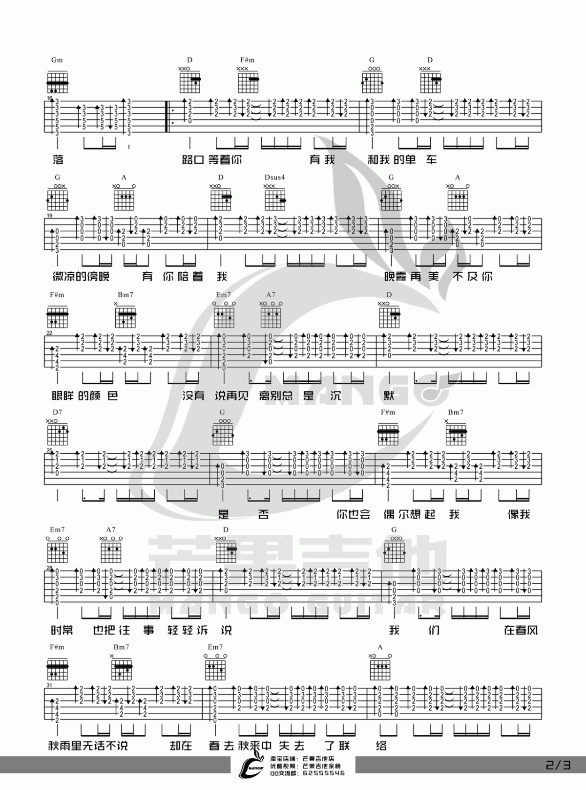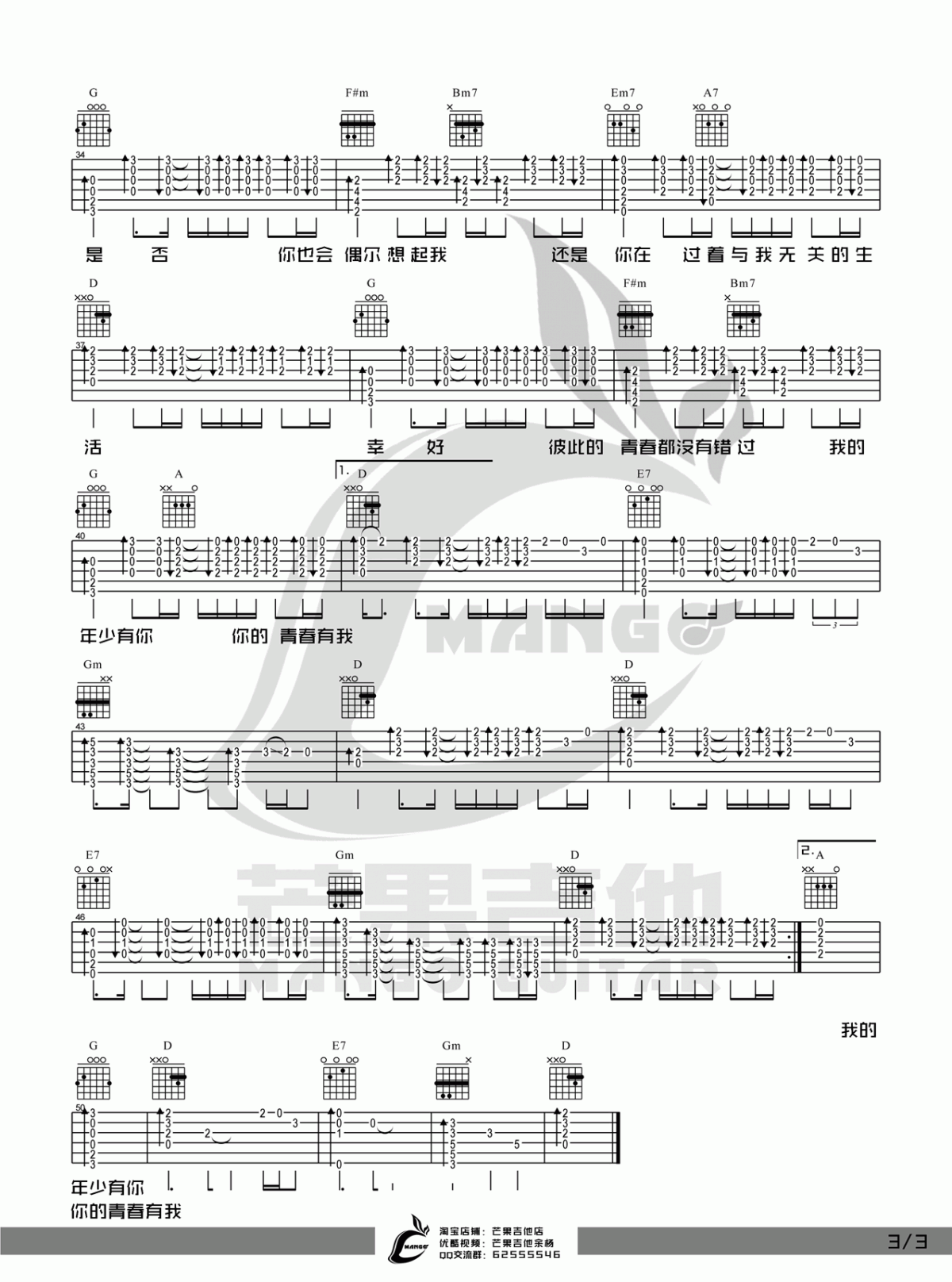 曲谱介绍: 《年少有你》吉他弹唱谱,采用D调指法编配,共有3张高清图谱。