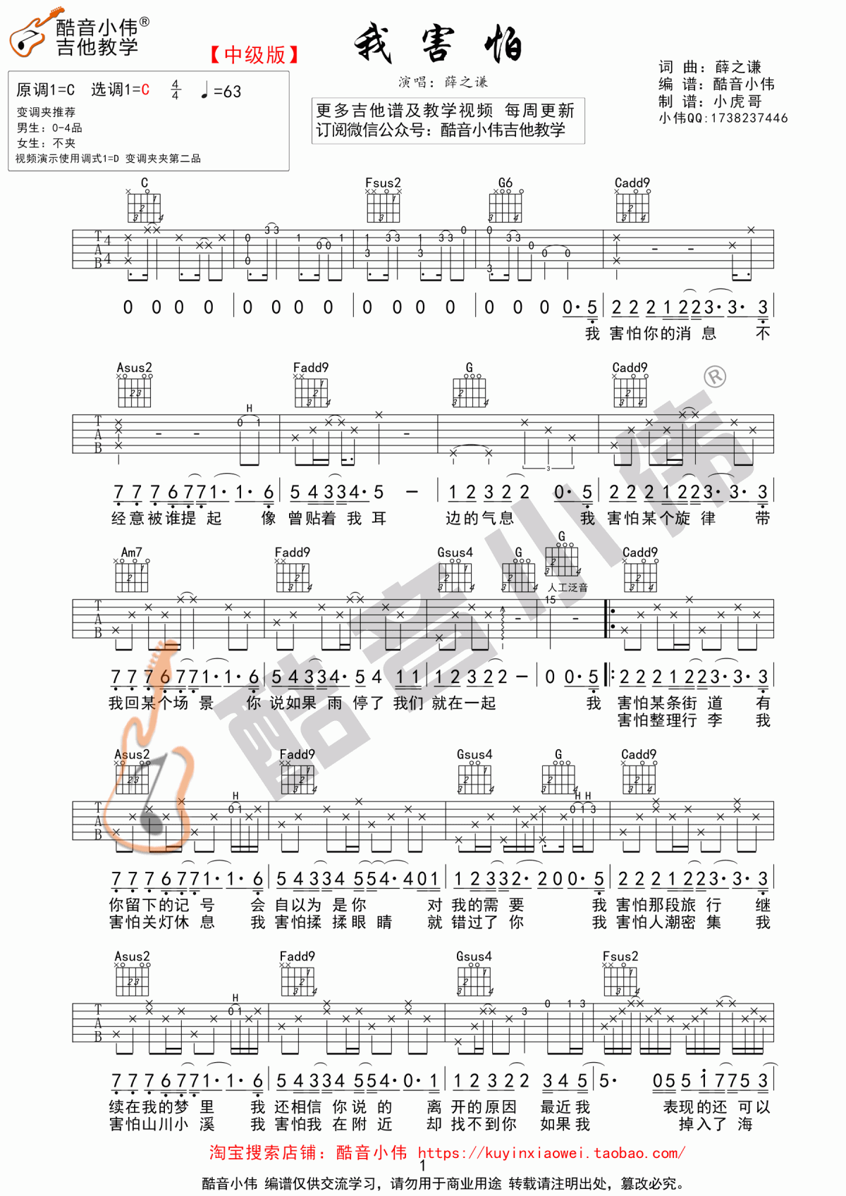 我害怕吉他谱 - 薛之谦 - C调吉他弹唱谱 - 原版