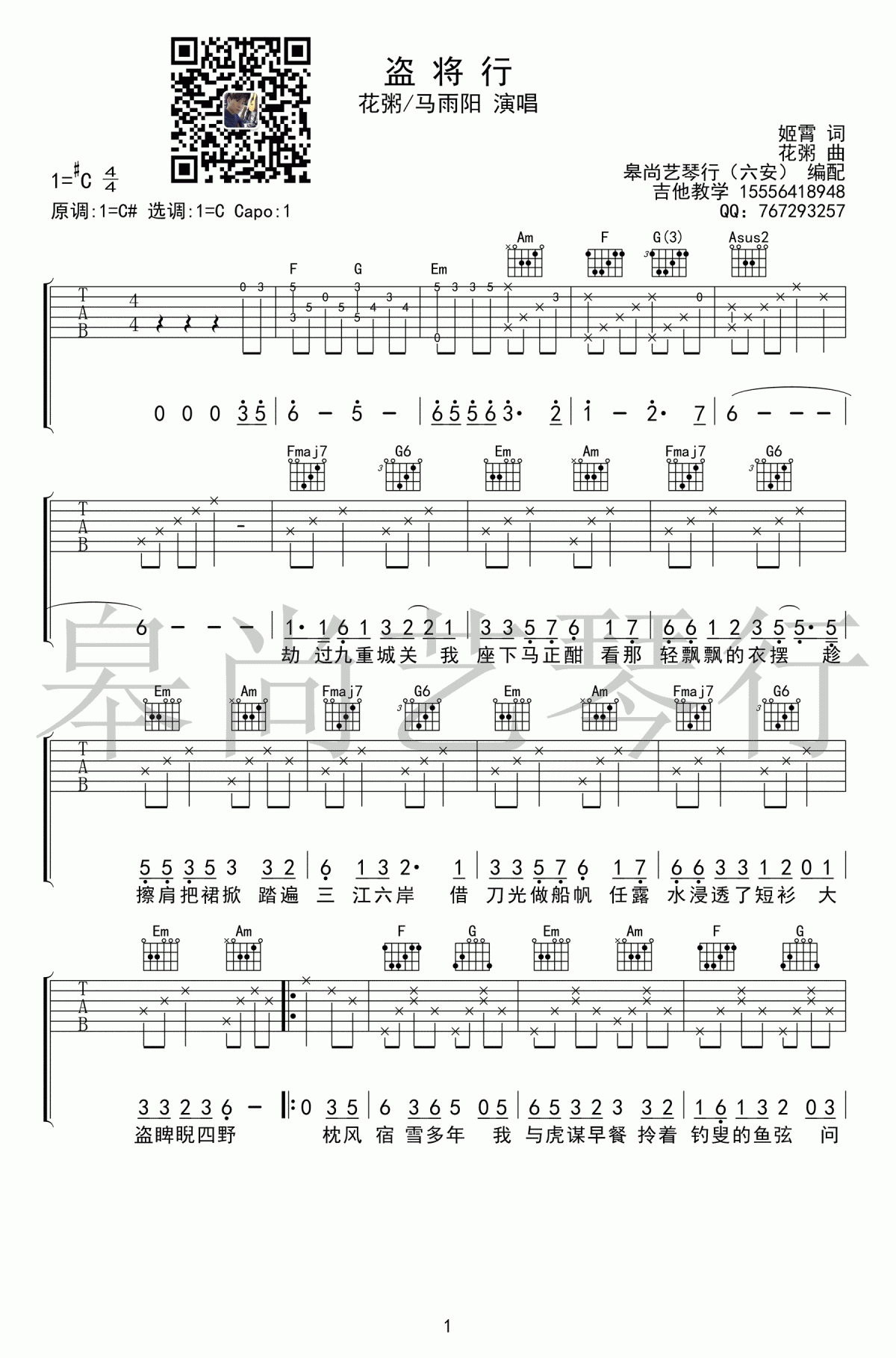 曲谱介绍: 花粥马雨阳《盗将行》吉他弹唱谱,采用C调指法编配,共有3张高清图谱。