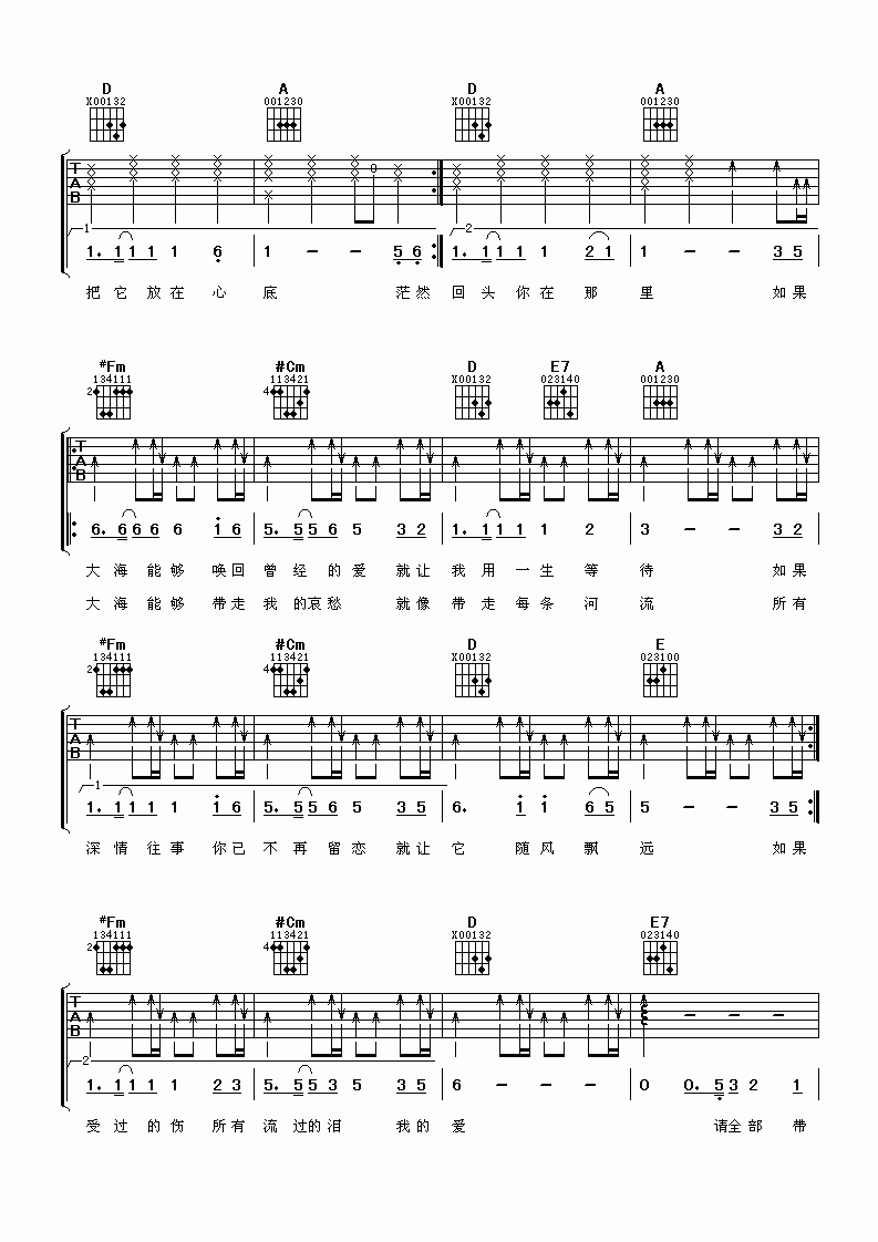 曲谱介绍: 张雨生《大海》吉他弹唱谱,共有4张高清图谱。