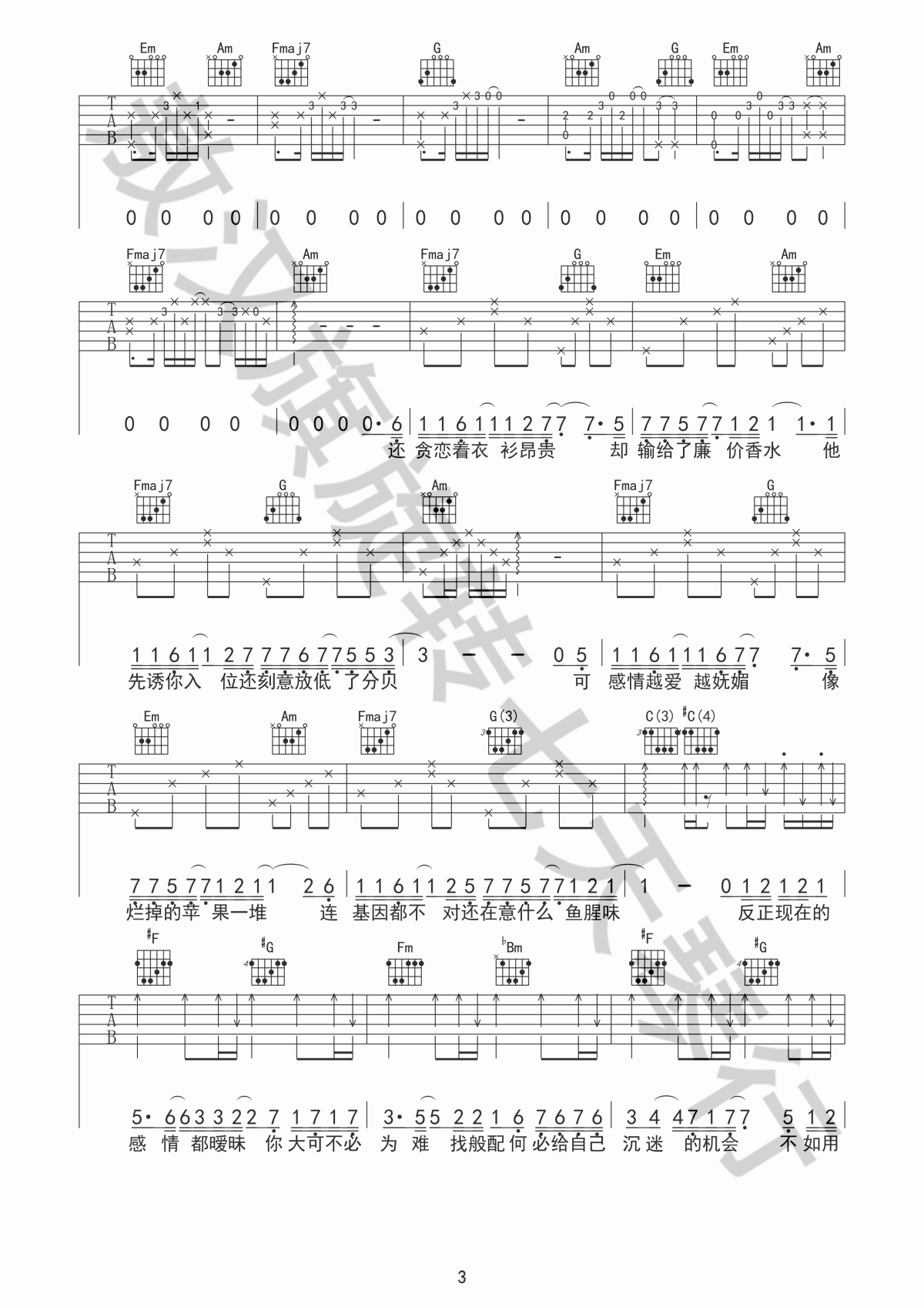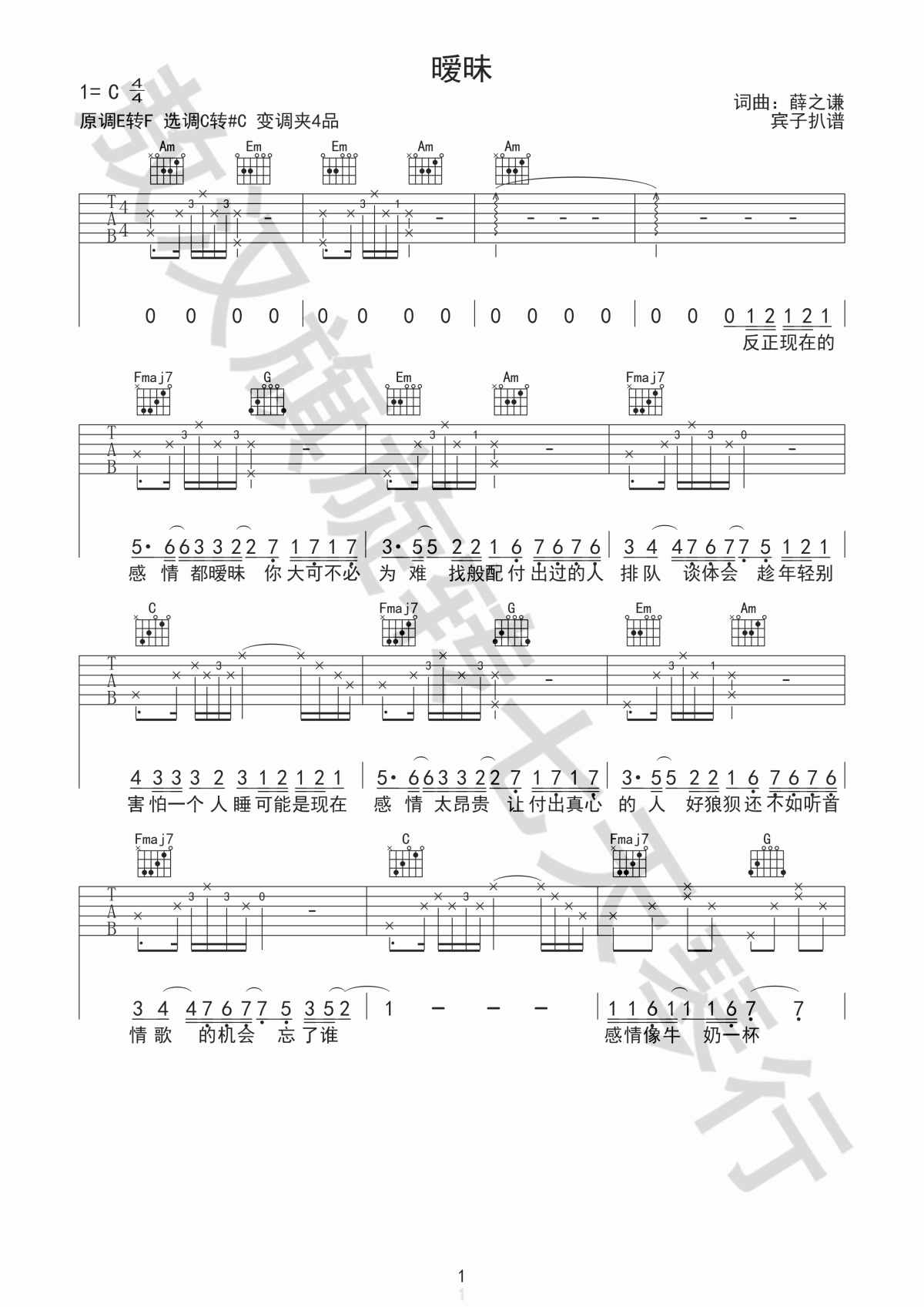曲谱介绍: 薛之谦《暧昧》吉他弹唱谱,采用C调指法编配,共有4张高清图谱。