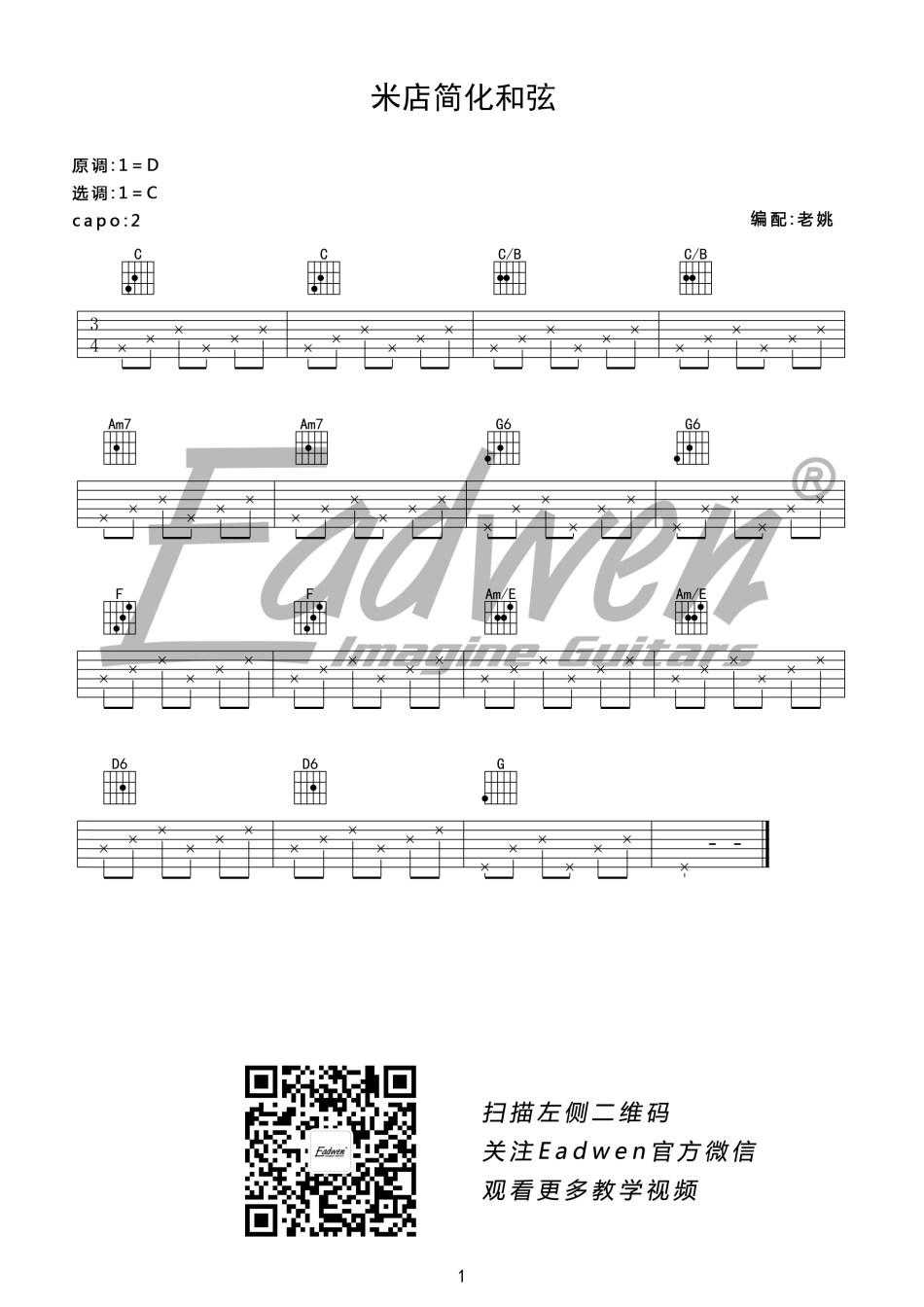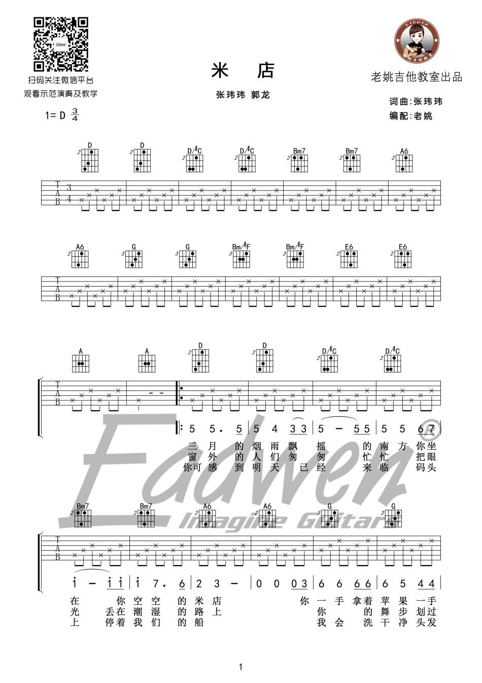 曲谱介绍: 米店《米店_D调》吉他弹唱谱,采用D调指法编配,共有4张高清图谱。