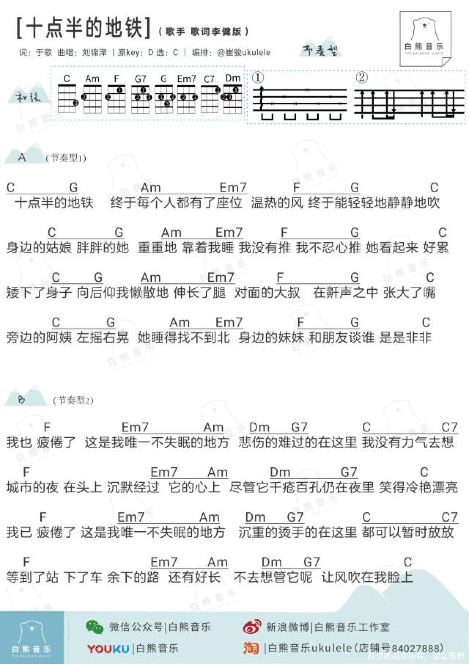 曲谱介绍: 李健&刘锦泽《十点半的地铁》_C调尤克里里谱