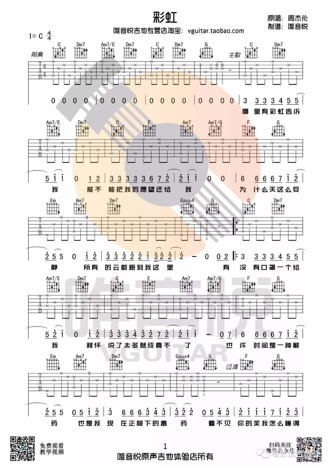 曲谱介绍: 彩虹《彩虹_C调》吉他弹唱谱,采用C调指法编配,共有3张高清图谱。