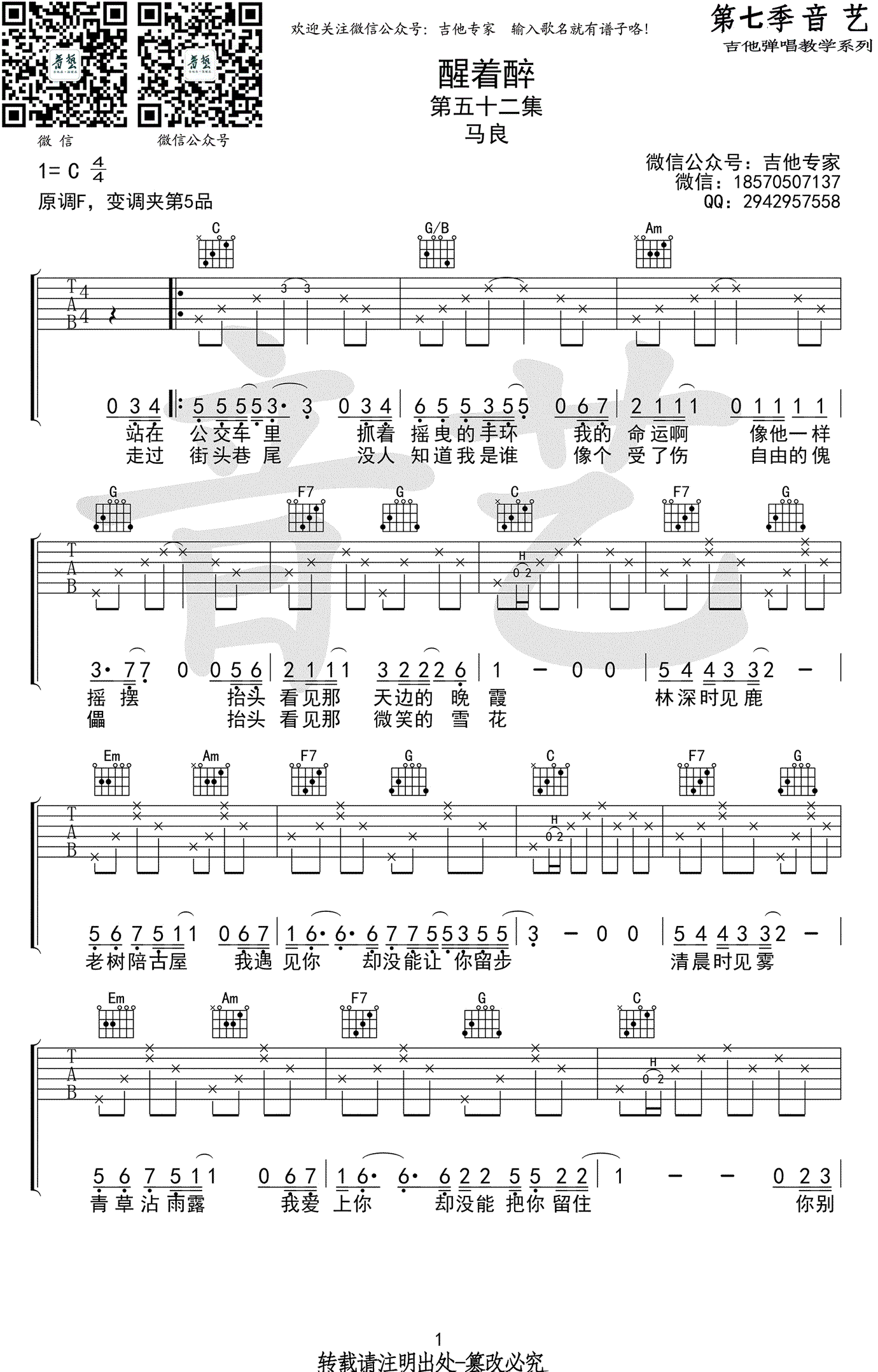 醒着醉吉他谱 - 马良 - C调吉他弹唱谱