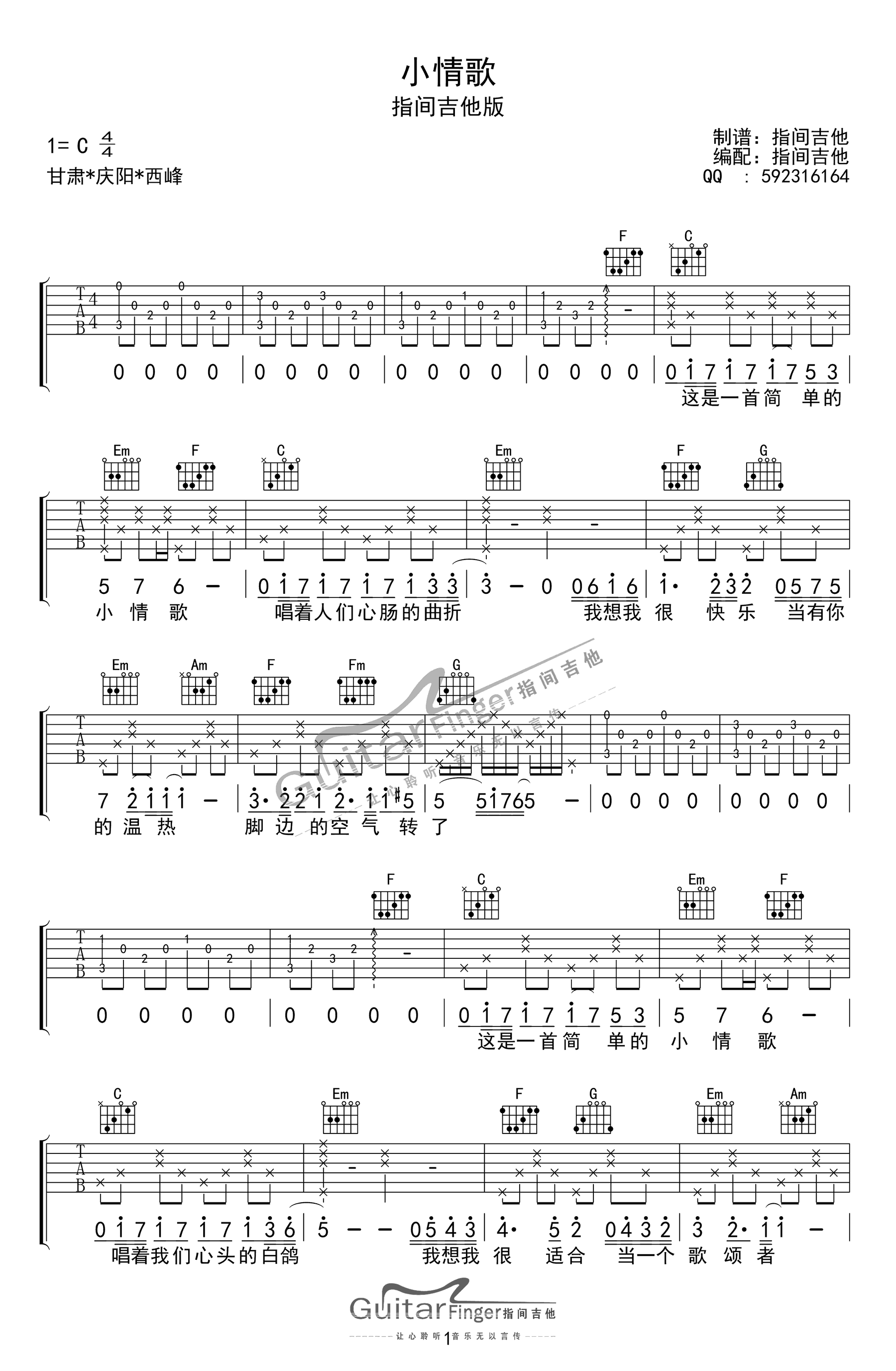 曲谱介绍: 小情歌吉他谱是根据歌手苏打绿的一首成名曲编配的吉他谱。吉他谱采用C调和弦编配,比较适合新手弹奏。这首歌曲是一首旋律简单的活泼的歌曲,听后你会更朝气蓬勃。扫除一切抑郁,吉他的和弦编配也非常好。活泼欢动。喜欢的朋友可以试试哦。感谢指间吉他编配此吉他谱。