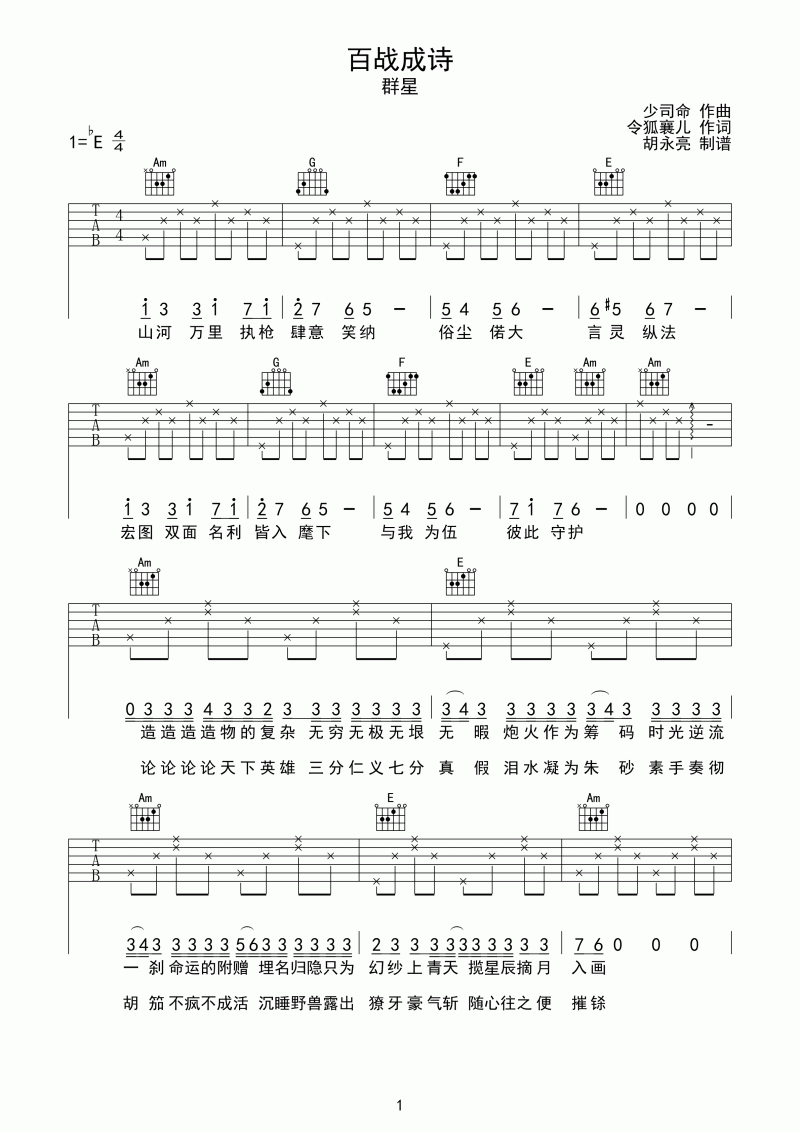 曲谱介绍: 百战成诗吉他谱是根据王者荣耀《王者之歌》编配的吉他谱。这首歌曲是在王者推出100的时候制作的英雄赞歌。把历史上的英雄、故事用古典的曲风融合成一首歌曲。听来非常震撼。吉他谱编配的也非常好。喜欢游戏的同学们弹弹试试哦。这是一首游戏类的吉他谱,体验一下游戏里的音乐风格也是不错的哦#