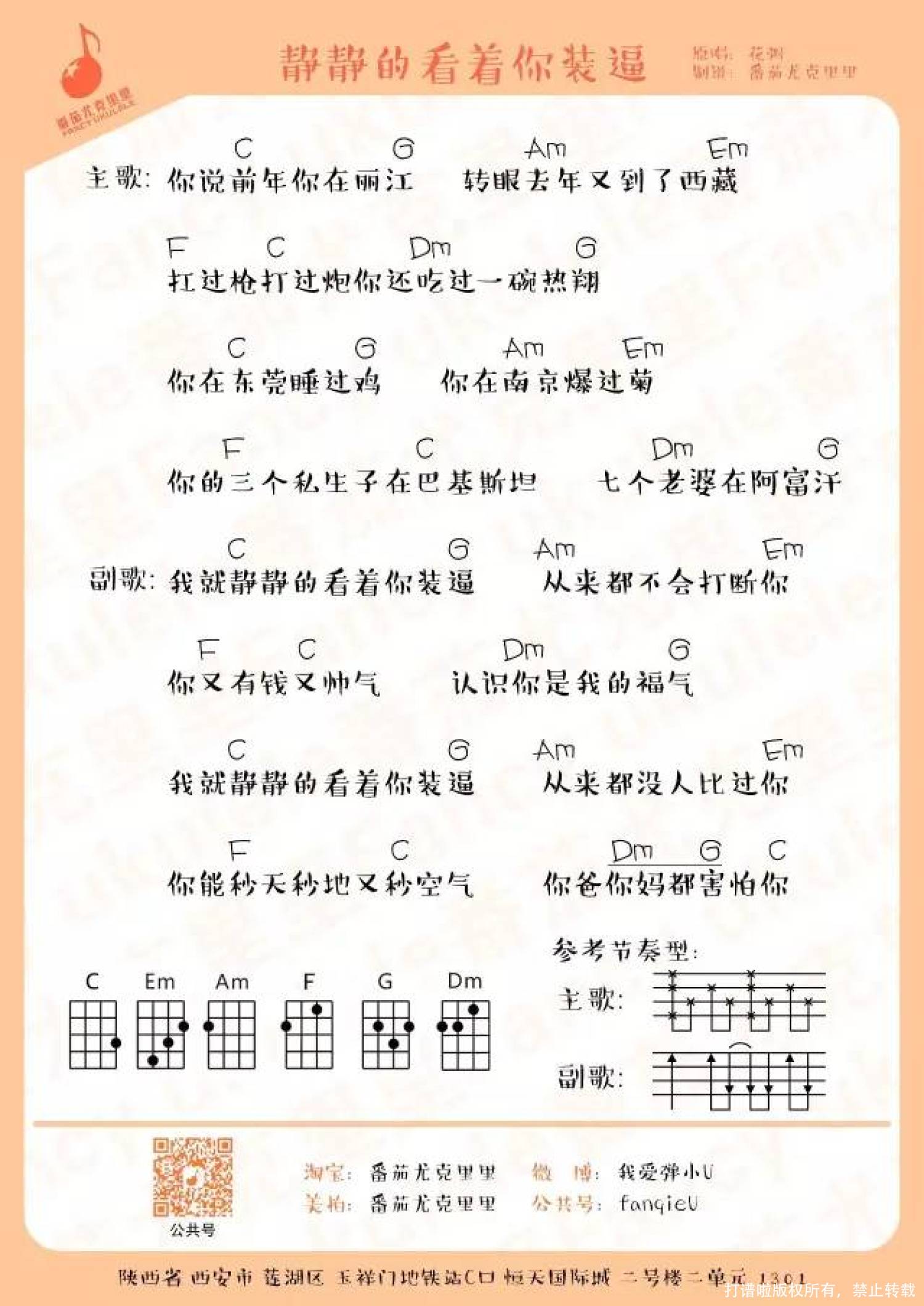 曲谱介绍: 花粥《静静地看着你装逼》_C调尤克里里谱