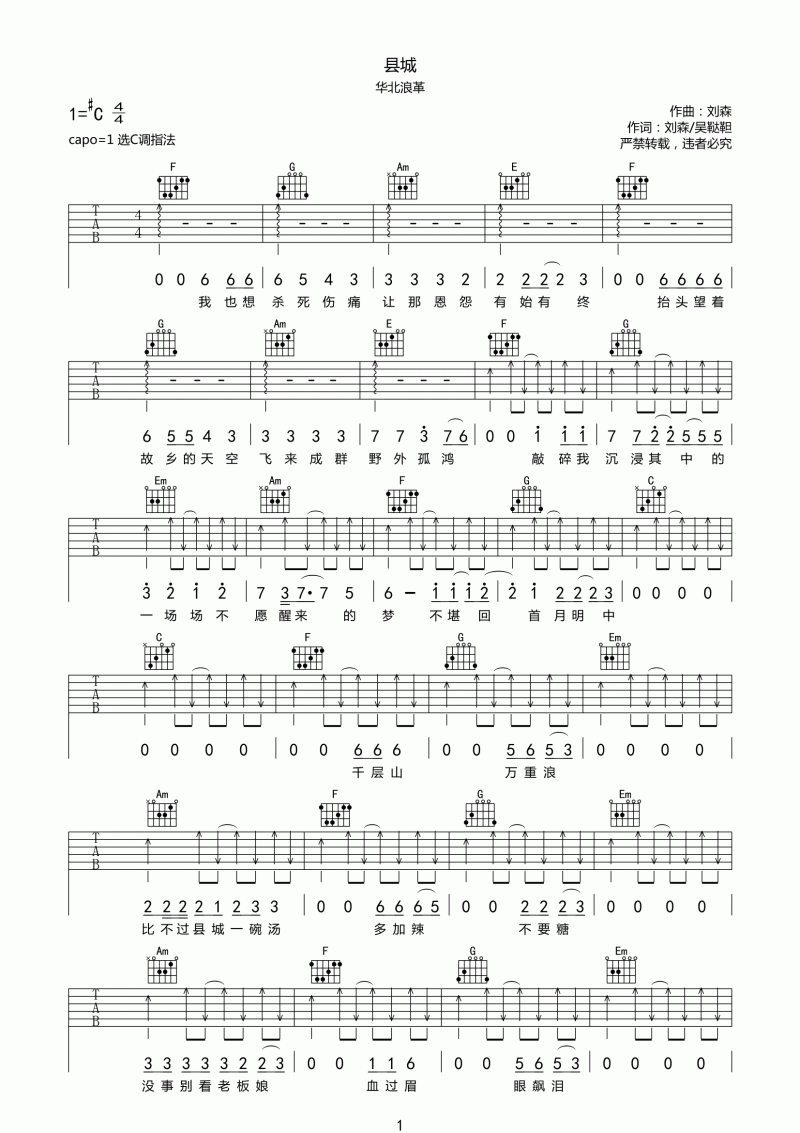 曲谱介绍: 县城吉他谱是根据歌手华北浪革的一首歌编配的吉他谱。歌曲原调#C,吉他谱采用C调指法编配,变调夹夹一品。 这首歌用一种激烈的词汇描述了复杂的感情体验。歌曲中对县城的记忆怀念渴求用一句句强烈的句子表达了出来。喜欢另类歌曲的朋友要试试哦。琴谱网编辑整理#