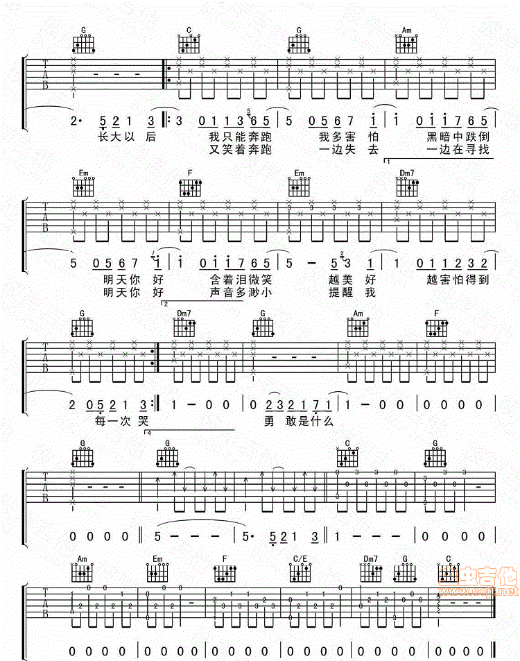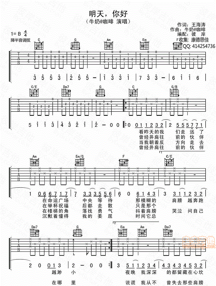曲谱介绍: 明天你好吉他谱是根据牛奶咖啡的一首歌歌曲编配的吉他谱,吉他谱采用C调编配。