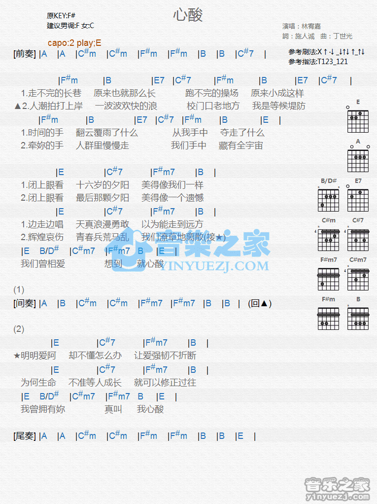 曲谱介绍: 《心酸》吉他谱是根据林宥嘉演唱的一首歌曲编配的和弦吉他谱。吉他谱原调#F调,男生建议F调 女生建议C调。一首年轻的爱情伤感歌曲,十六岁的懵懂到最终的分别,歌曲中充满了那种悔恨和辛酸的味道。从校园时代的相遇,经历过的美好,