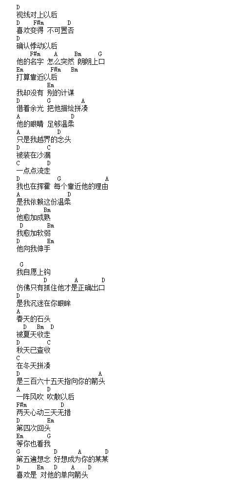 曲谱介绍: 单向箭头吉他谱是根据歌手双笙的歌曲编配的吉他谱。此吉他谱编配跟原版差距很小采用D调和弦编配。喜欢的朋友不要错过。这首歌曲唱出了小女生那种对爱情的渴望和对他的暗恋。那种柔情蜜意在吉他的伴奏下非常的有感觉。单向箭头也许就是单相思的意思把。喜欢的朋友要试试哦。琴谱网编辑整理#@