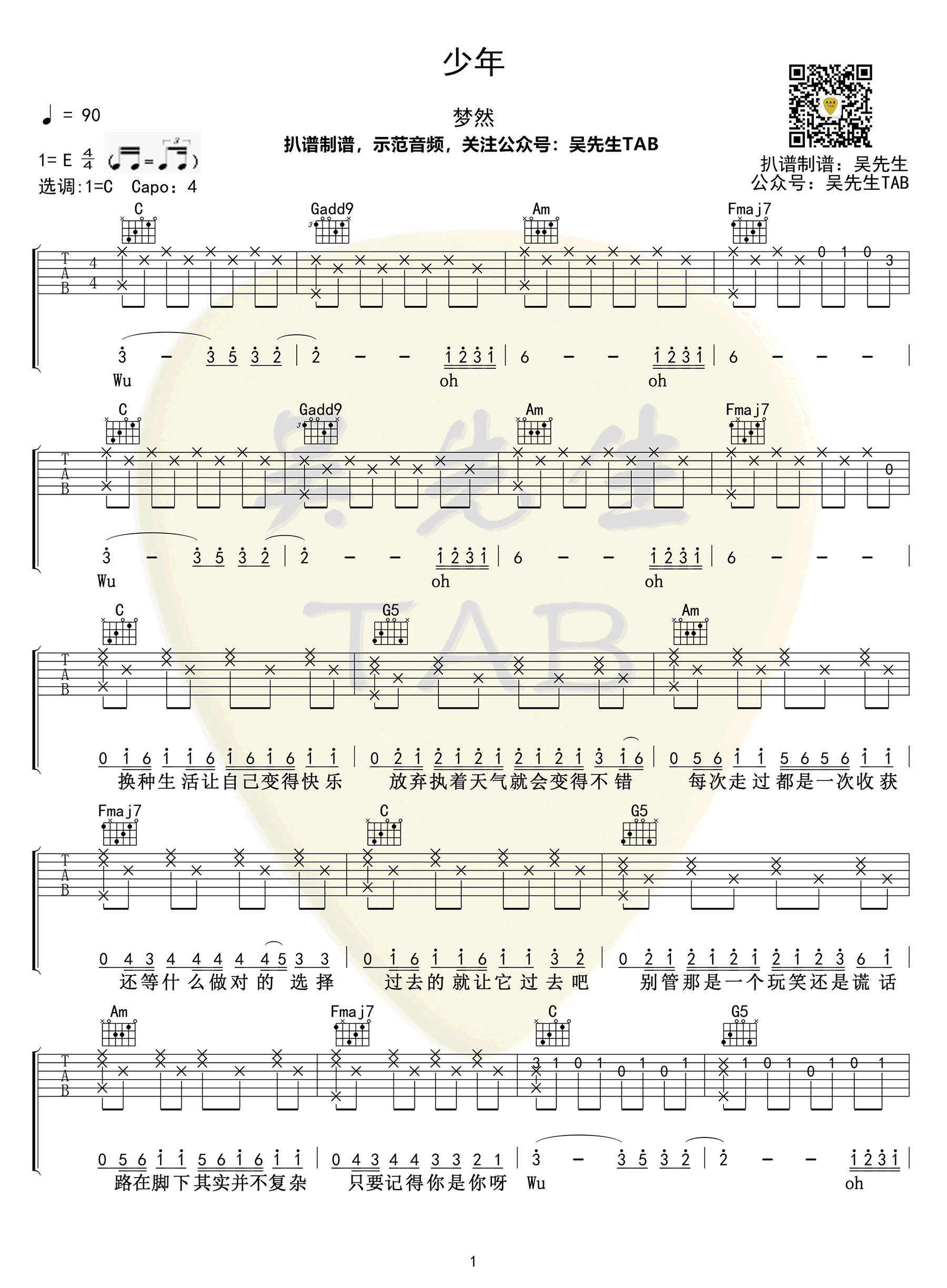曲谱介绍: 《少年》吉他谱是根据歌手梦然的一首歌曲编配的吉他谱。歌曲原调E吉他谱采用C调指法编配。变调夹夹四品。这首歌曲唱出了少年那种青春向上永远有活力的感觉。这首歌曲也是给每个少年朋友的励志歌曲。歌曲曲调富有激情,能够激发心底那种澎湃的热情。喜欢的朋友一定要试试哦。琴谱网编辑整理#