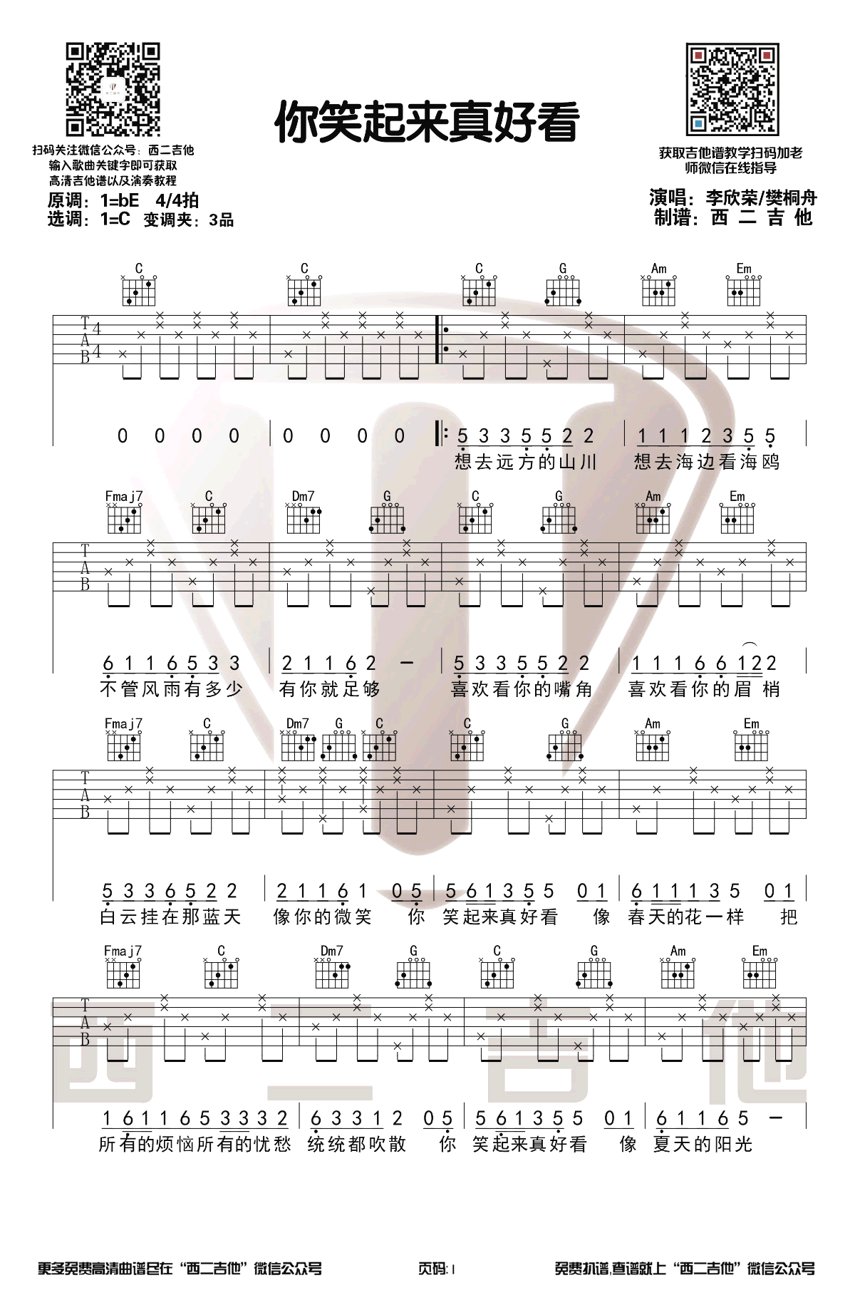 曲谱介绍: 《你笑起来真好看》吉他谱是根据李昕融樊桐舟和李凯稠演唱的一首歌曲编配的吉他谱。一首经典的歌曲,曲调活泼,歌词唯美可爱。这首歌曲也在网络上火了。歌曲原调bE,吉他谱采用C调编配,变调夹夹三品。你笑起来真好看,像春天的阳光。一句句经典的洗脑歌词,一遍遍的听不厌倦,在大街小巷你会发行这首歌曲的确很流行。拿起吉他弹奏这首可爱的歌曲吧。琴谱网编辑整理#