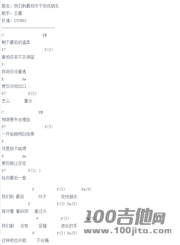 曲谱介绍: 我们到最后终于变成朋友吉他谱是根据歌手王睿的一首歌曲编配对吉他谱,吉他谱采用C调指法编配。吉他谱C调比较容易弹奏,喜欢的朋友请收藏哦。琴谱网编辑整理#