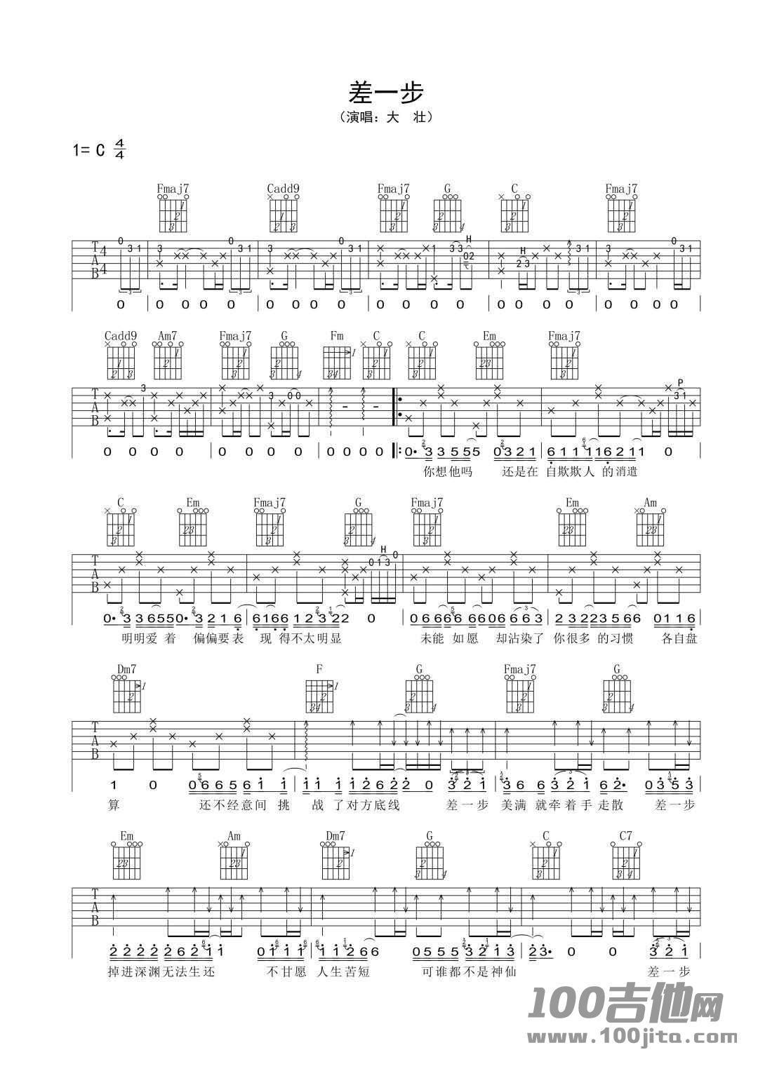 曲谱介绍: 差一步吉他谱是根据歌手大壮的一首歌曲编配的吉他谱。吉他谱采用C调指法编配非常好听的曲子。差一步其实也是对现实的无奈,和面对困难永不言弃的精神。 差一步(演唱:大壮) 1=c4 Fmaj7 Cadd9 Fmaj7 Fmaj73 E Fmaj7 Fmaj Em 明明爱着偏偏要表现得不太明显 未能如愿却沾染了你很多的习惯各自盘 Dm7F Fmaj7 算还不经意间挑战了对方底线 差一步美满就牵着手走散差一步 Em Am oom 掉进深渊无法生还 不甘愿人生苦短可谁都不是神仙 这首歌是由大壮演唱的一首经典歌曲。 旋律旋律优美,合适,令人陶醉 和弦的进行随意曲子的情感意境恰当就好 喜欢的琴友可以弹唱