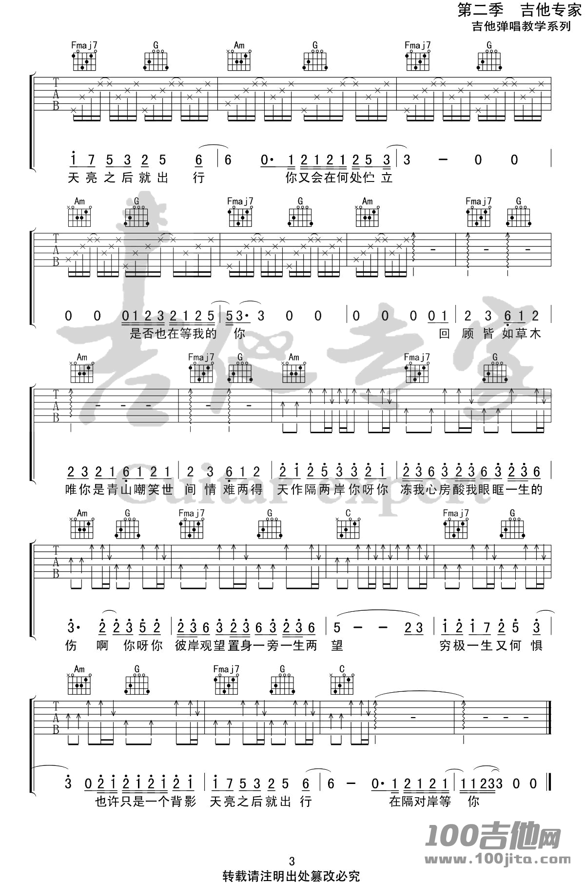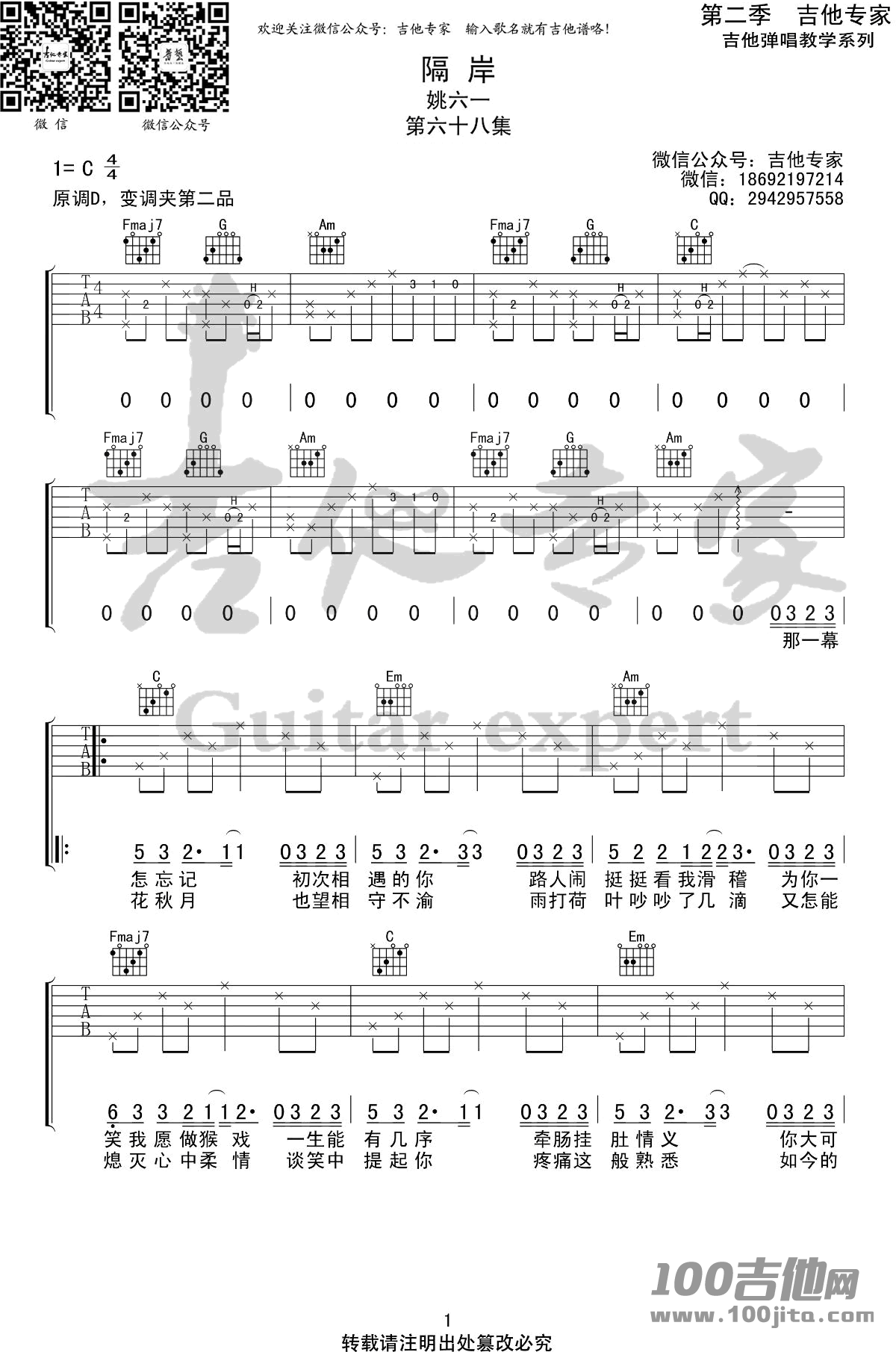 曲谱介绍: 姚六一《隔岸》吉他弹唱谱,采用C调指法编配,共有3张高清图谱。