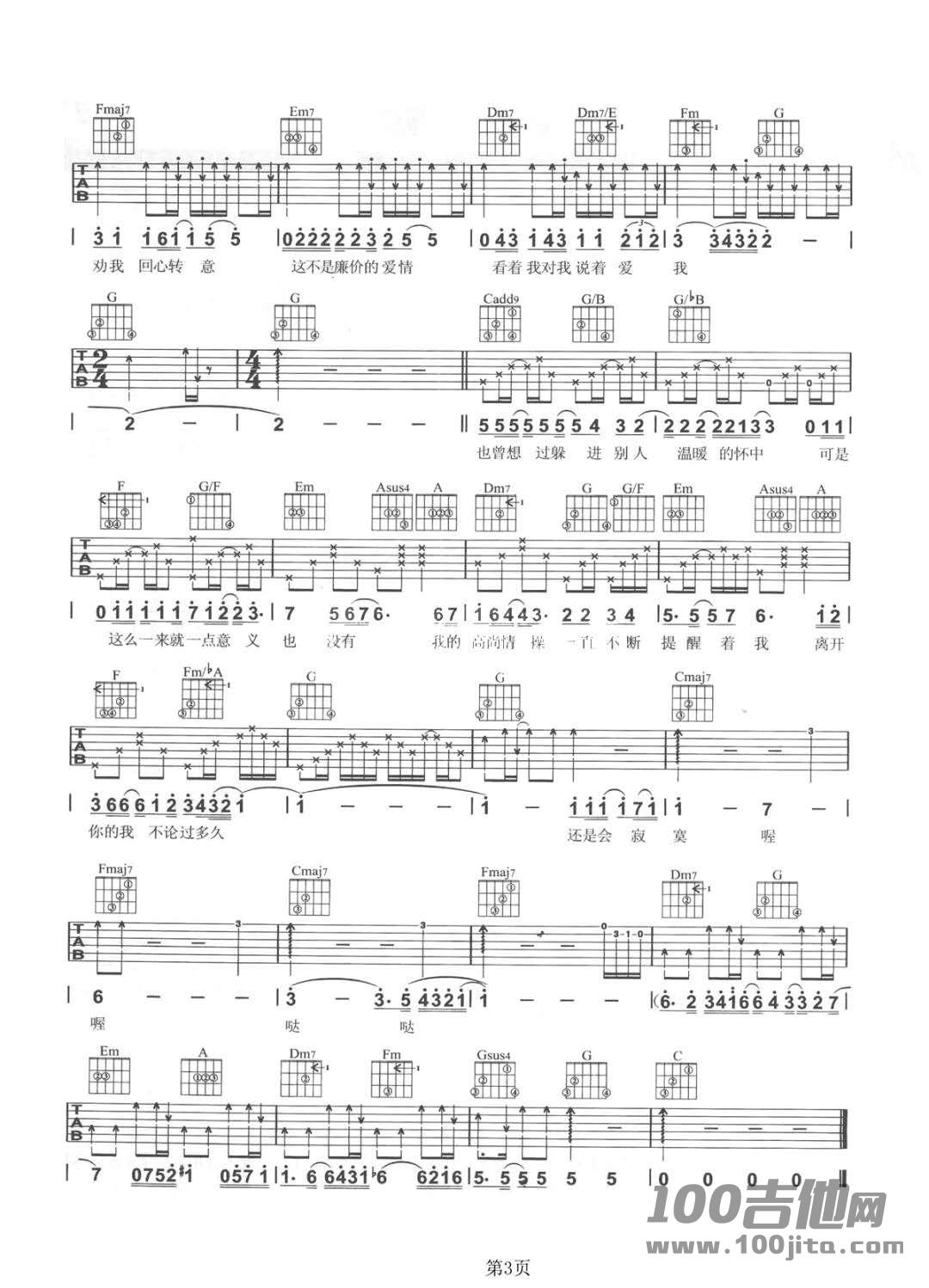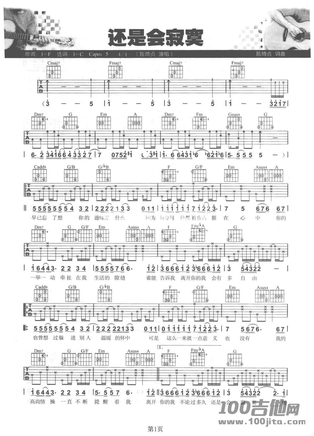 曲谱介绍: 陈绮贞《还是会寂寞》吉他弹唱谱,采用C调指法编配,共有3张高清图谱。
