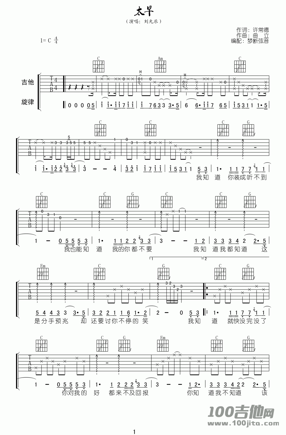 曲谱介绍: 刘允乐《太早》吉他弹唱谱,采用C调指法编配,共有3张高清图谱。