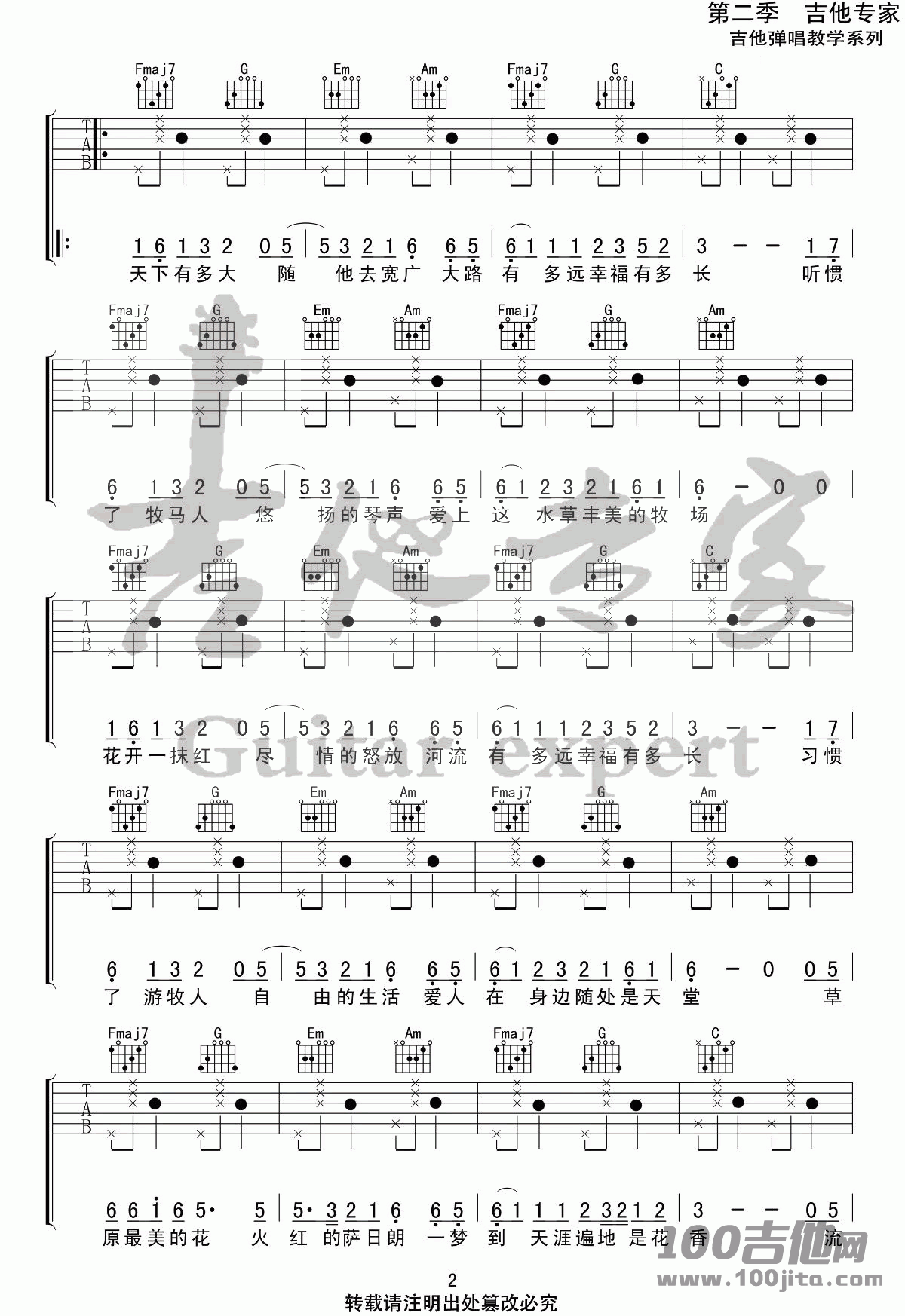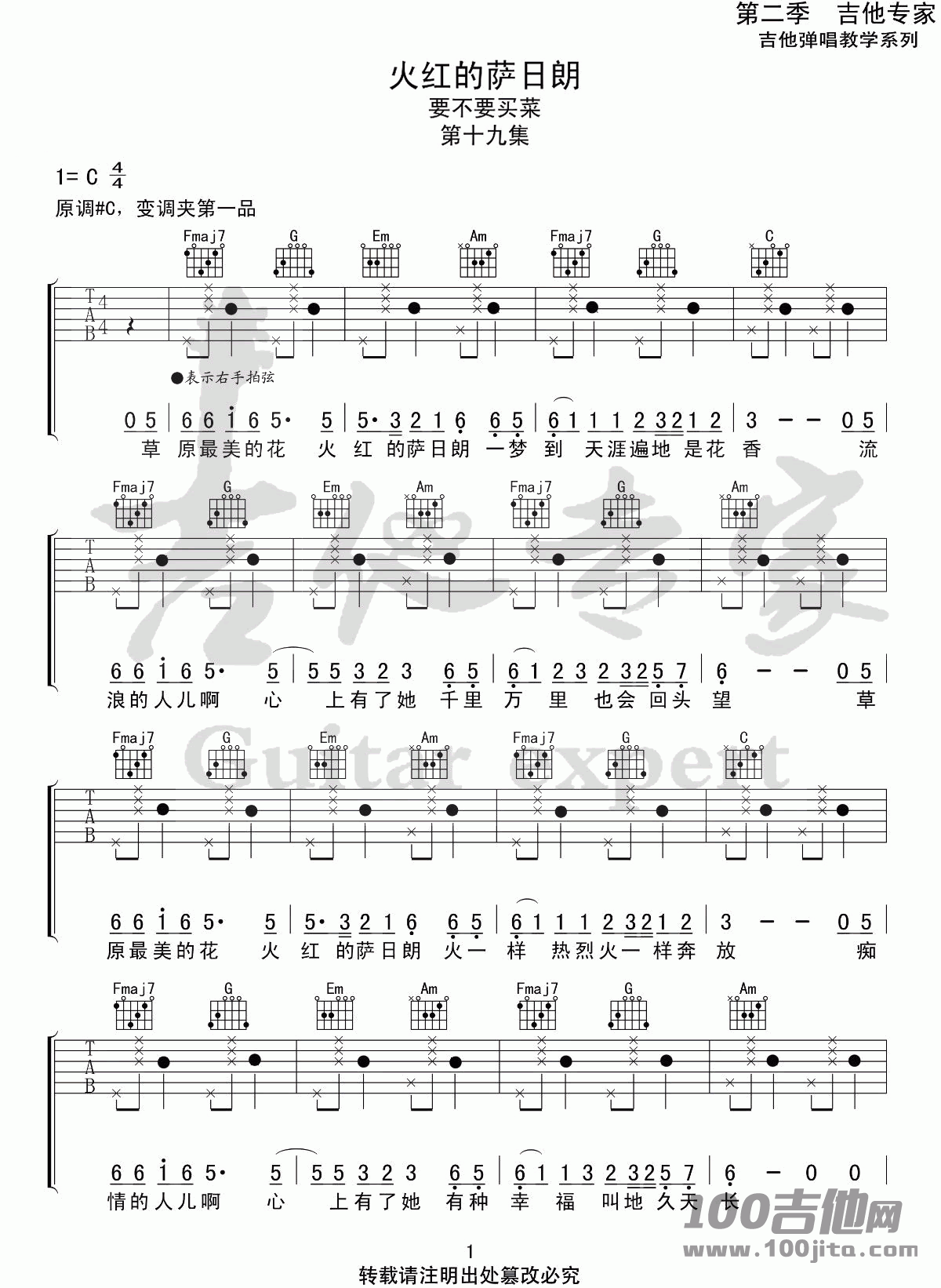 曲谱介绍: 要不要买菜《火红的萨日朗》吉他弹唱谱,采用C调指法编配,共有3张高清图谱。