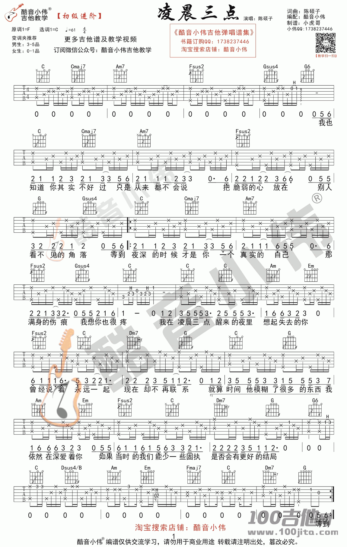 曲谱介绍: 陈硕子《凌晨三点》吉他弹唱谱,采用C调指法编配,共有2张高清图谱,免翻页排版设计。