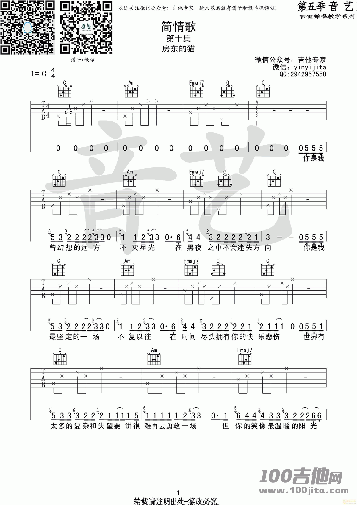曲谱介绍: 房东的猫《简情歌》吉他弹唱谱,采用C调指法编配,共有3张高清图谱。