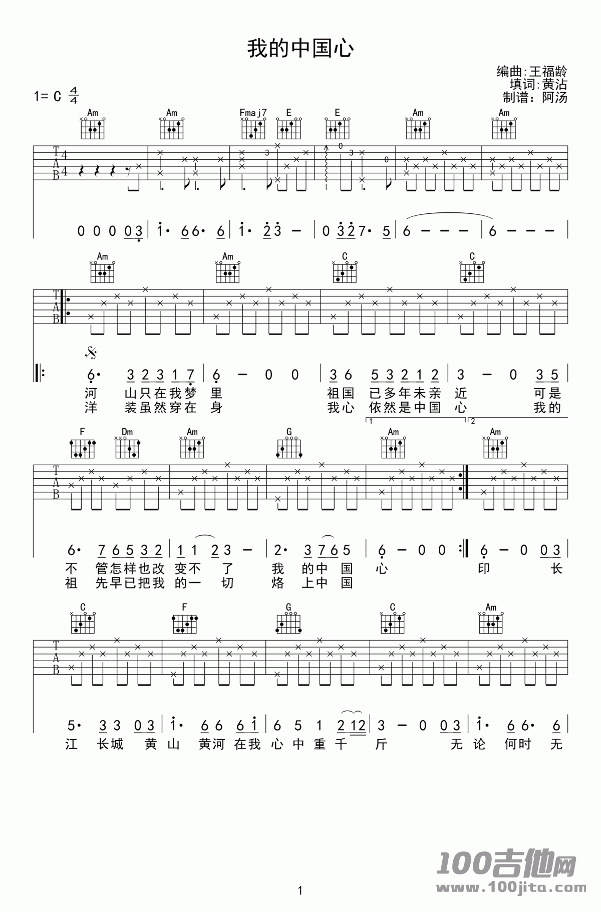 曲谱介绍: 《我的中国心》吉他谱是根据歌手张明敏的一首歌曲编配的吉他谱,吉他谱采用C调指法编配。一首爱国主义浓厚的歌曲。每到十一必唱的一首经典爱国歌曲。张明敏用浑厚的嗓音加上那淡淡的沧桑感演绎了这首歌曲,让这首歌曲成了时代的经典,成为了比较著名的中国歌曲。这首歌曲唱出了远在海外的游子思念祖国的情怀,无论身处那里,无论在什么时候,心里永远有一颗中国心。喜欢此歌曲的朋友不要错过哦。琴谱网编辑整理#