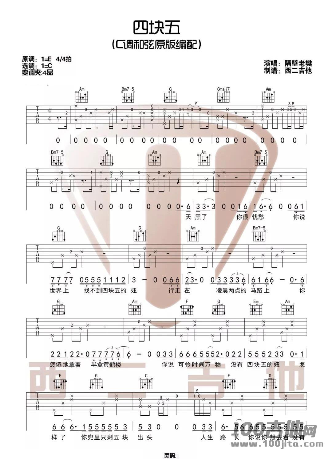 四块五吉他谱 - 隔壁老樊 - C调吉他弹唱谱
