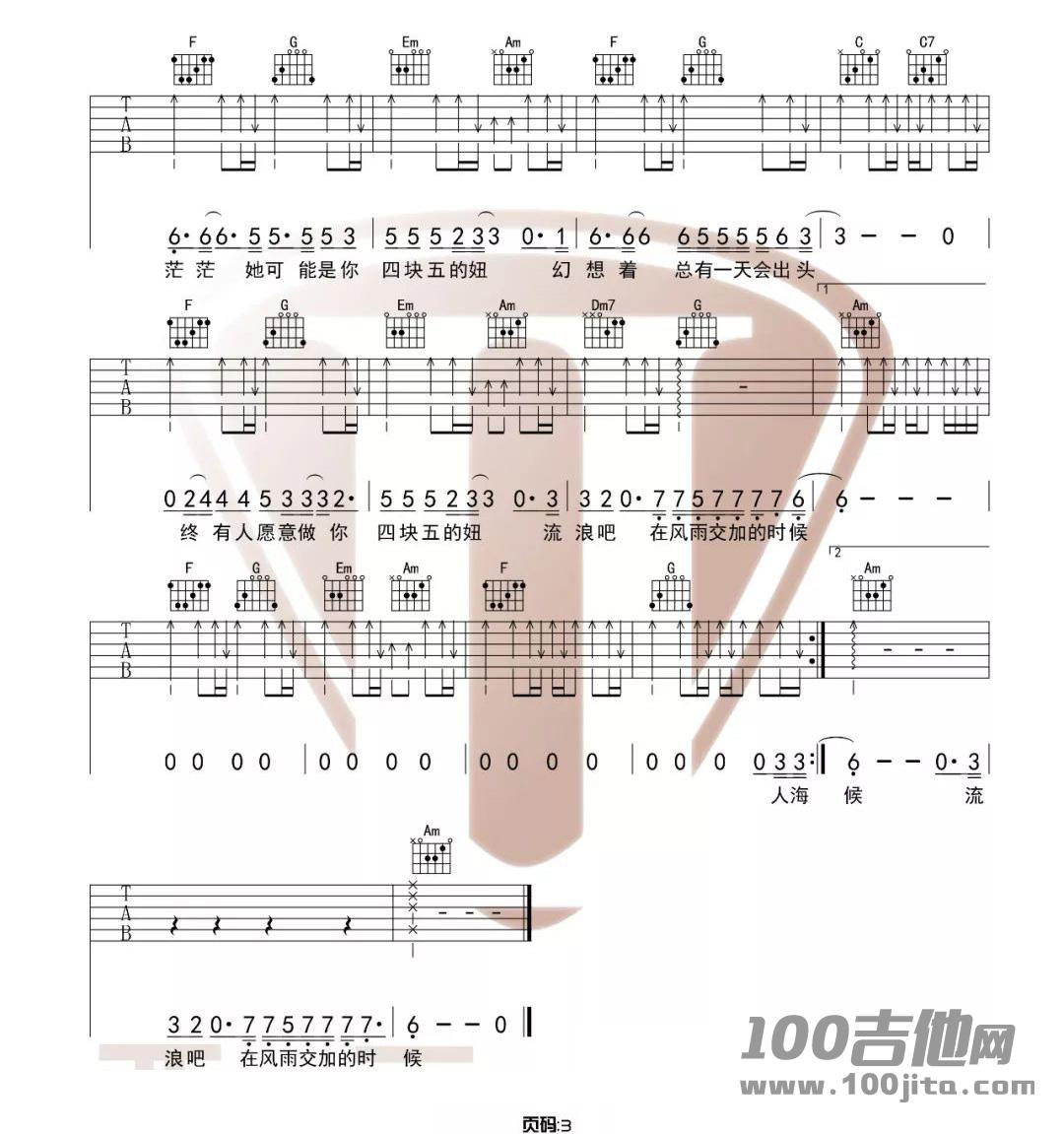 曲谱介绍: 隔壁老樊《四块五》吉他弹唱谱,采用C调指法编配,共有3张高清图谱。