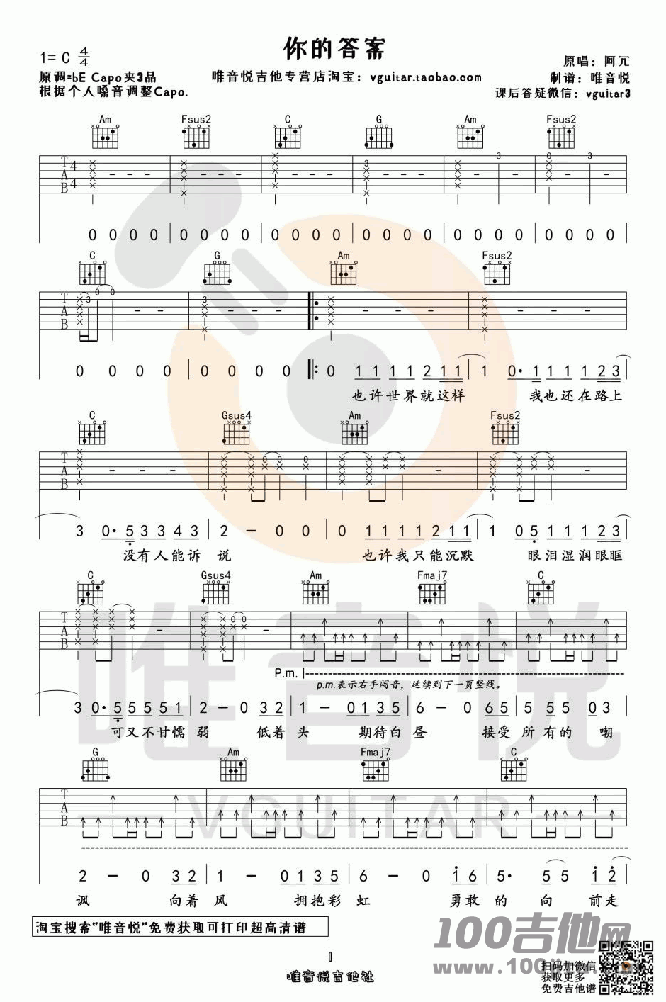 曲谱介绍: 阿冗《你的答案》吉他弹唱谱,采用C调指法编配,共有2张高清图谱,免翻页排版设计。