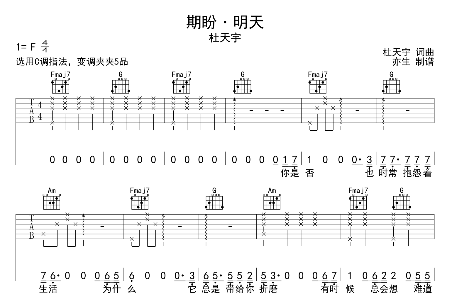 曲谱介绍: 杜天宇《期盼·明天》吉他谱_C调指法吉他六线谱分享。杜天宇《期盼·明天》吉他谱,由亦生制谱,共三张高清图片谱,本谱采用C调和弦指法编配,节奏为4/4拍,速度为95拍每分钟,弹唱建议变调夹夹5品,难度简单