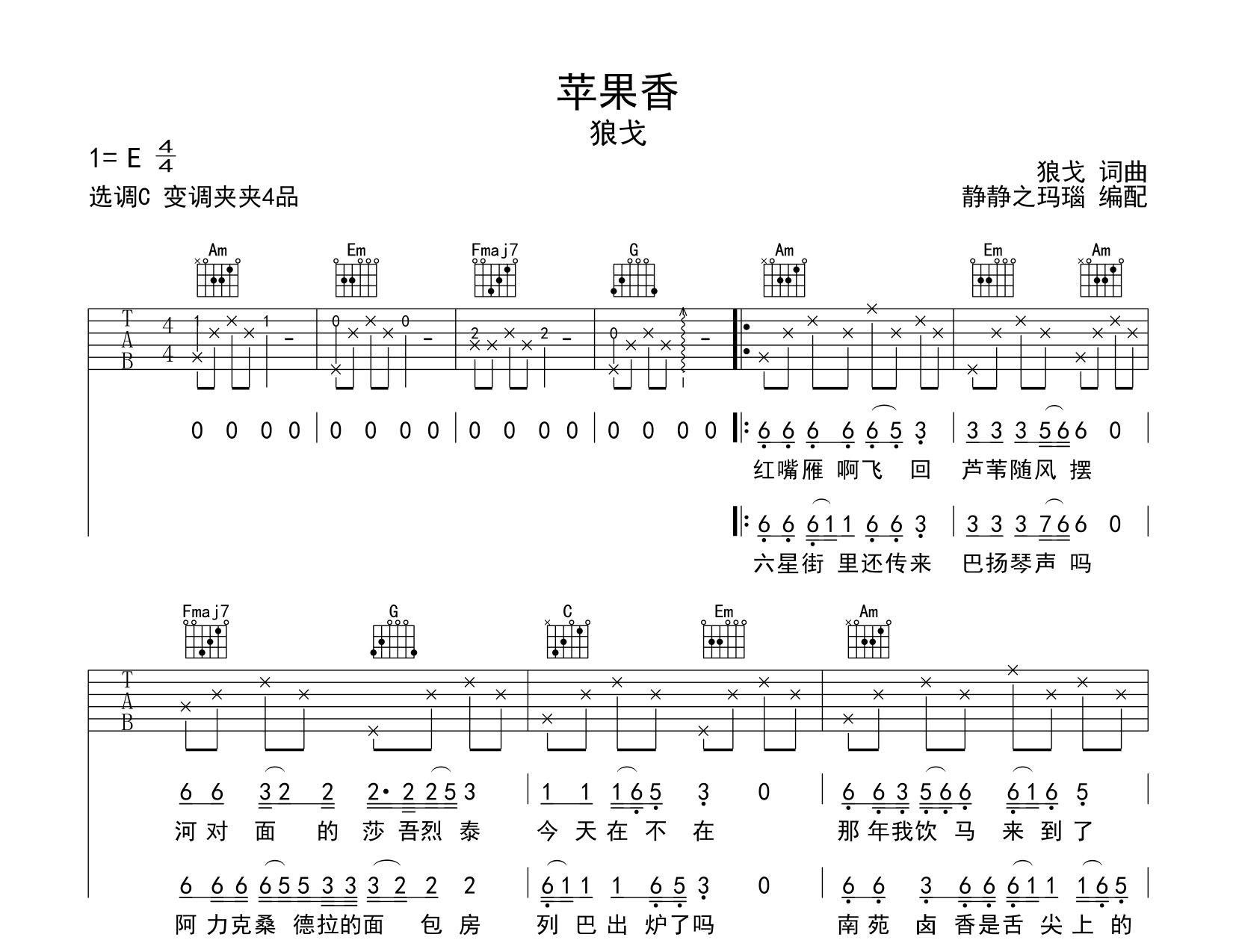 曲谱介绍: 苹果香吉他谱_狼戈_《苹果香》C调高清版六线谱分享,《苹果香》是狼戈老师给伊犁写给世界听的一首歌,地域的独特韵味不断从歌中飘荡出来,就仿佛如苹果成熟时的香味,湖蓝色的院墙,草原上的白毡房,还有二哥的弹弓叉,都是伊犁六星街儿时最美的记忆。 苹果香吉他谱,狼戈演唱,本谱采用C调和弦指法编配,节奏为4/4拍,速度为75拍每分钟,弹唱建议变调夹夹4品,难度初级,本谱由创作者@静静之玛瑙制谱。
